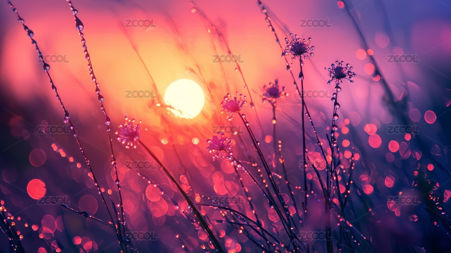 日出露珠草丛