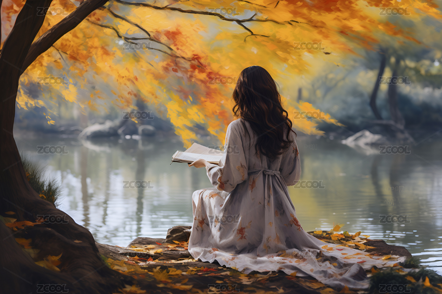 秋天坐在河边的美女插画