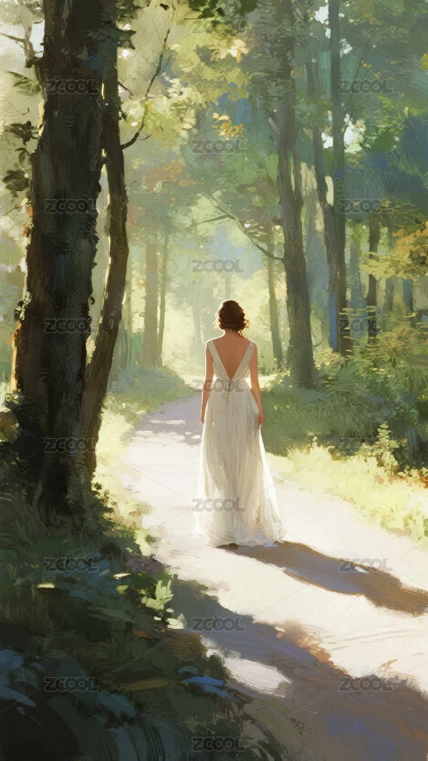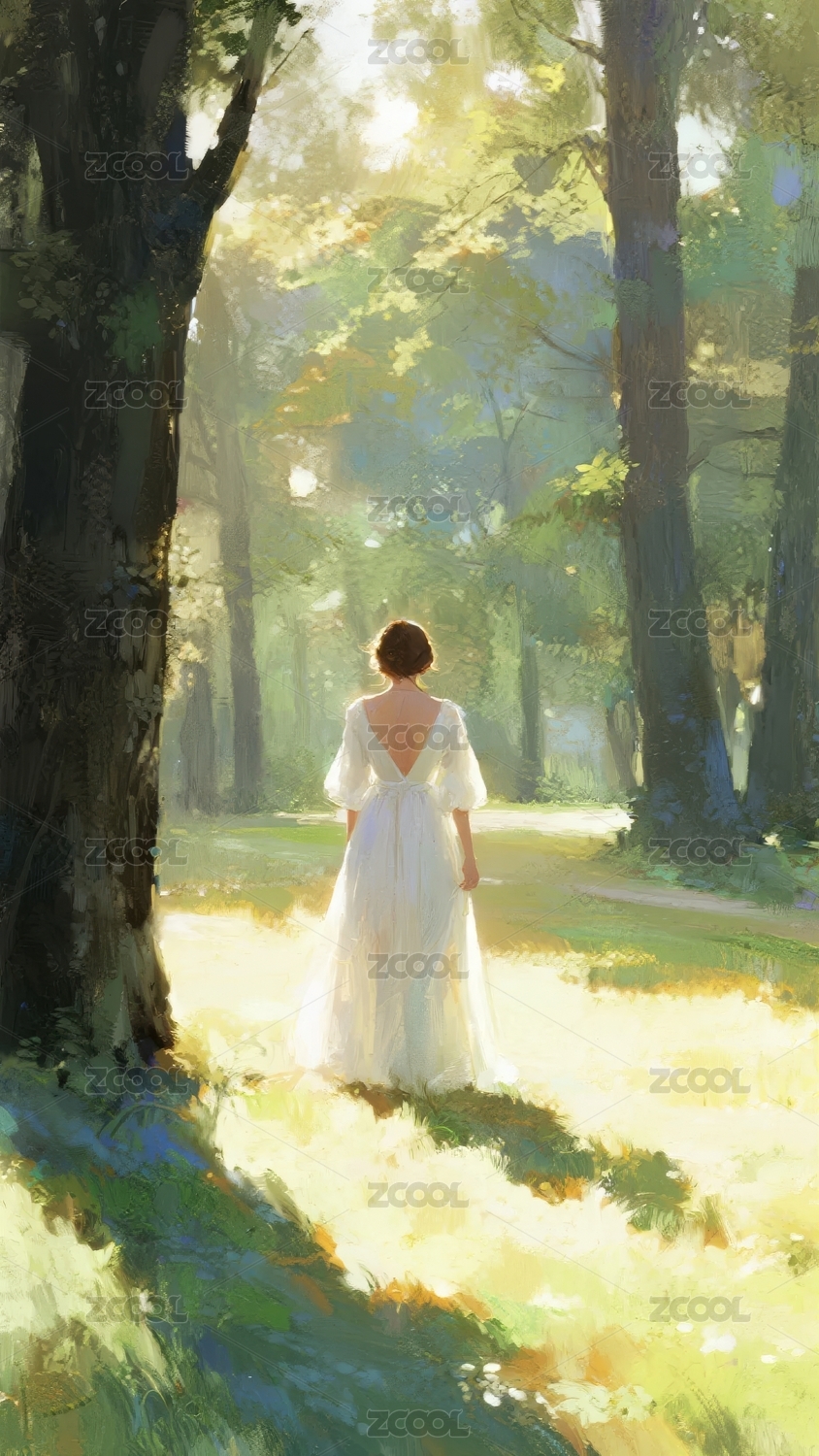 林间小径上的白衣女子