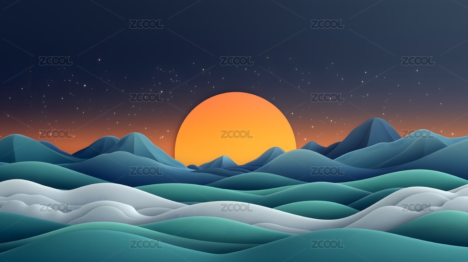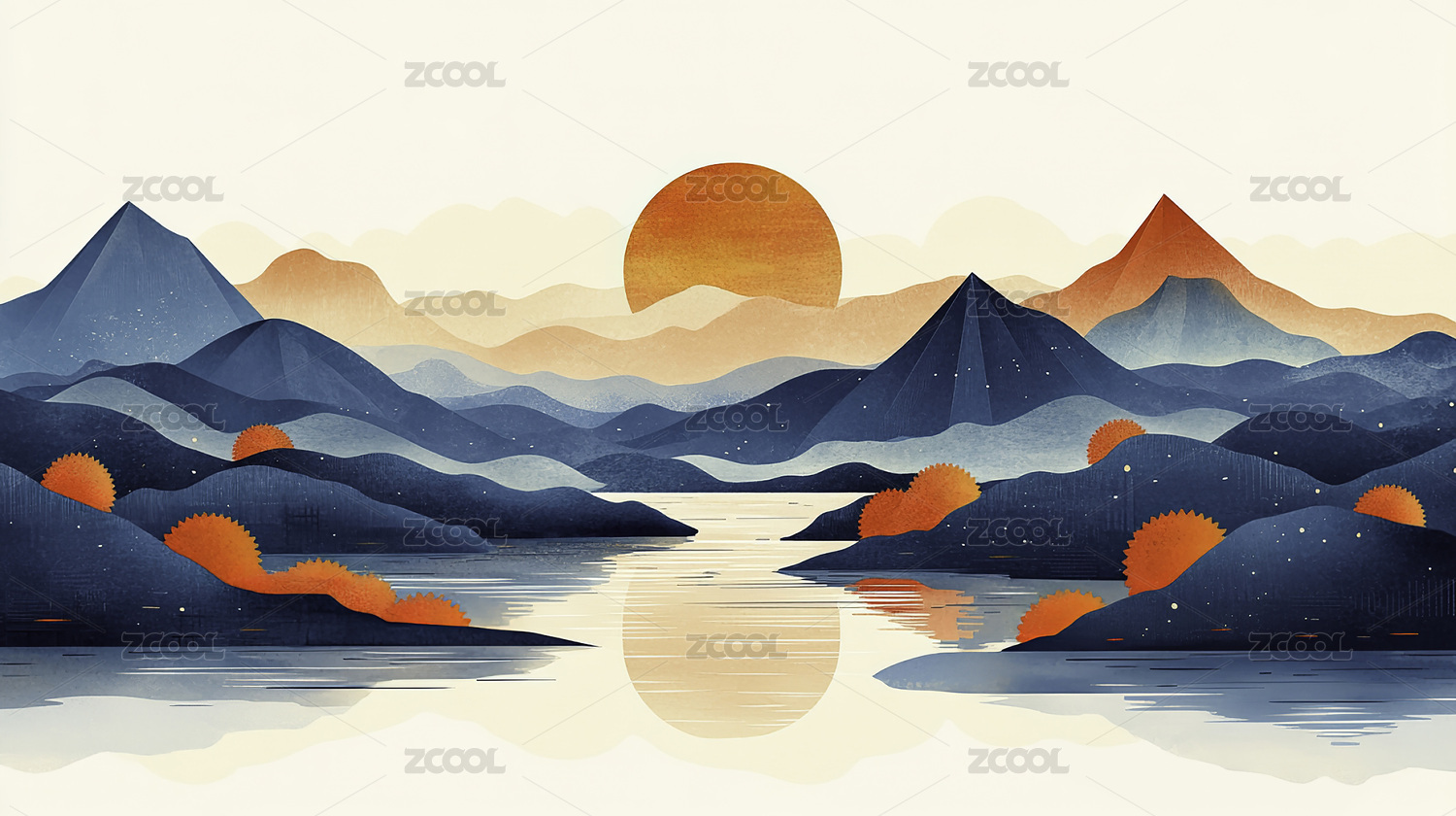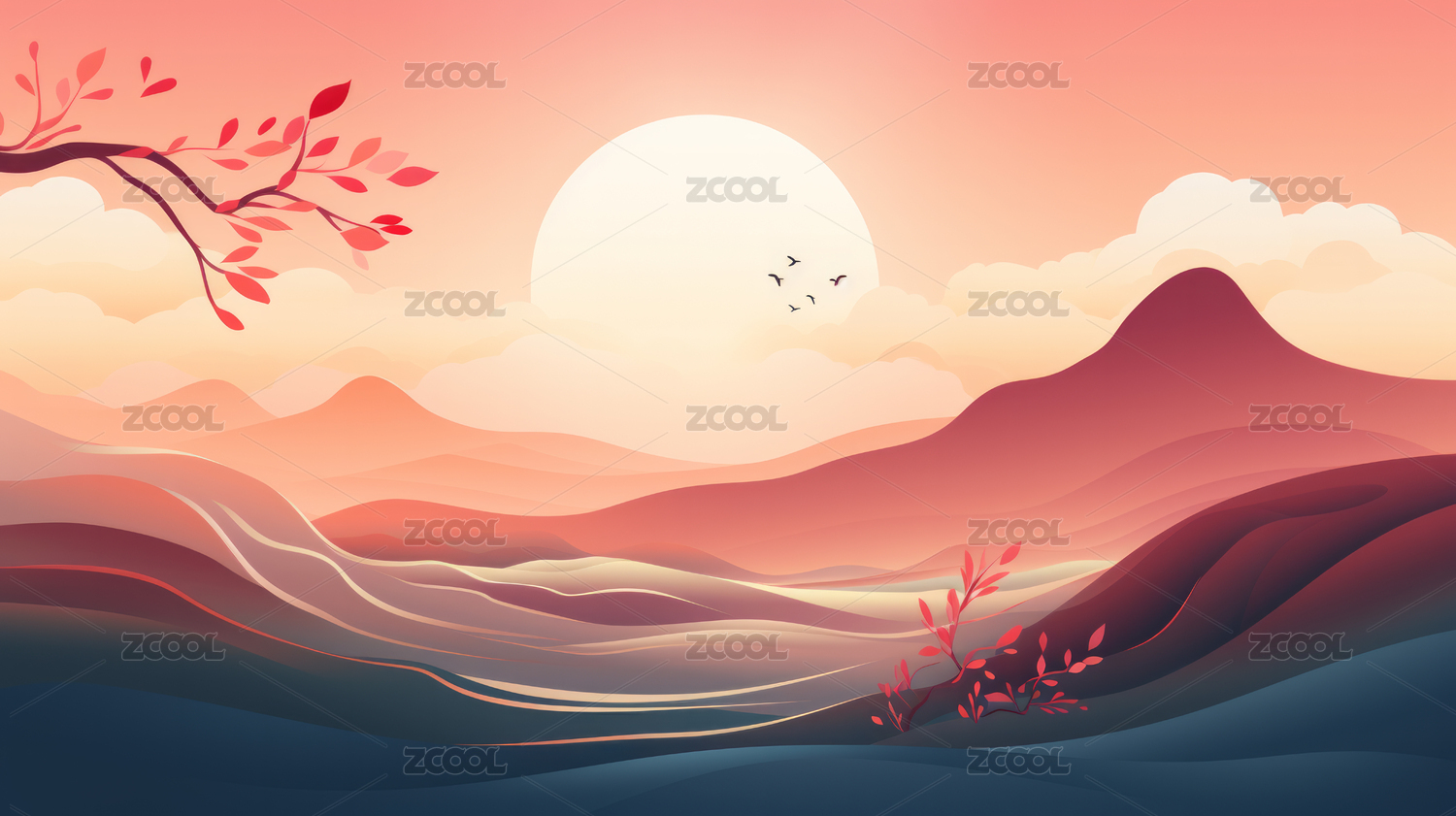 树,2D,平面,插画,插图,山,水,远山,群山,太阳