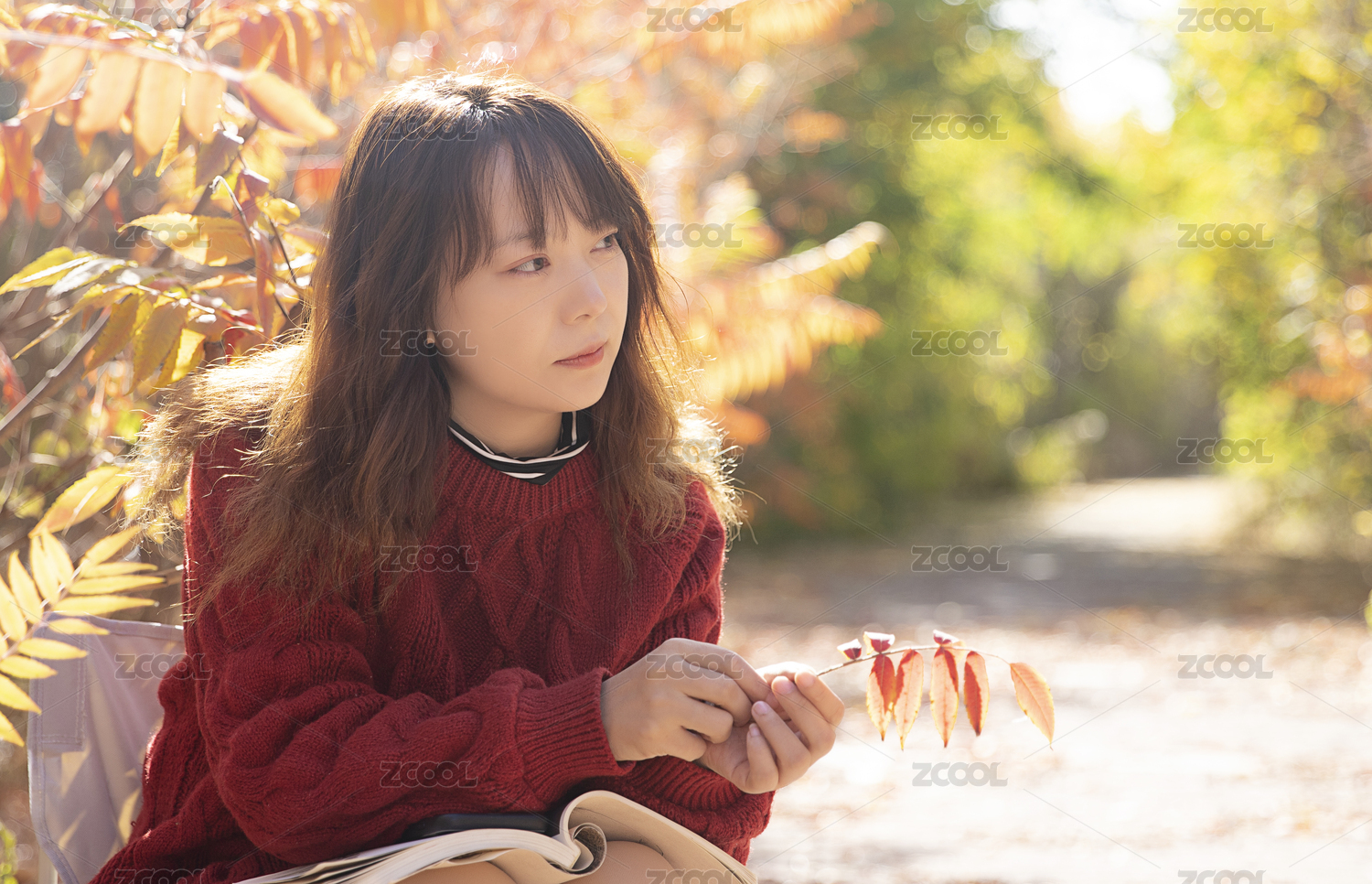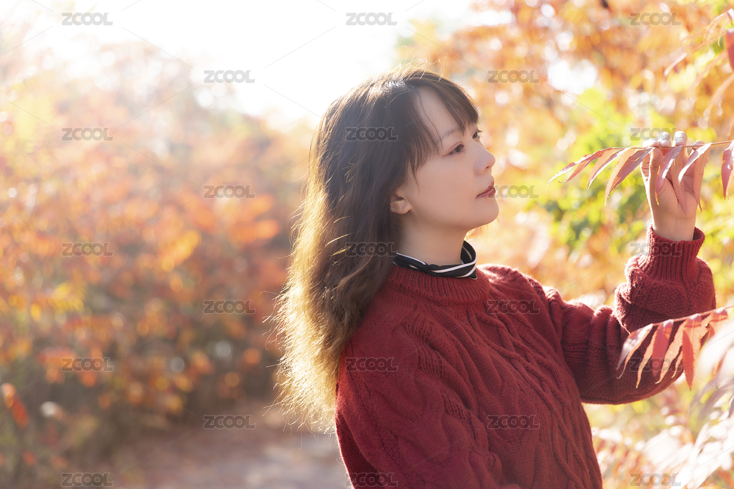女人,红叶,枫叶,公园,户外,亚洲人,红色,逆光,阳光,午后