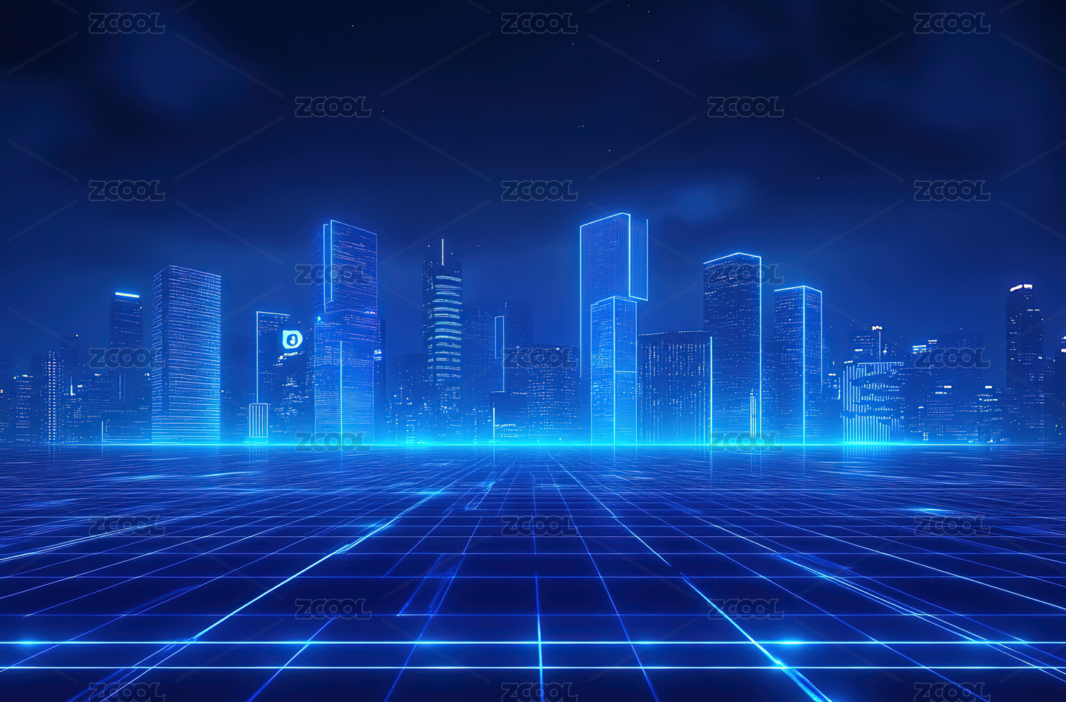 蓝色网格线前景的城市天际线