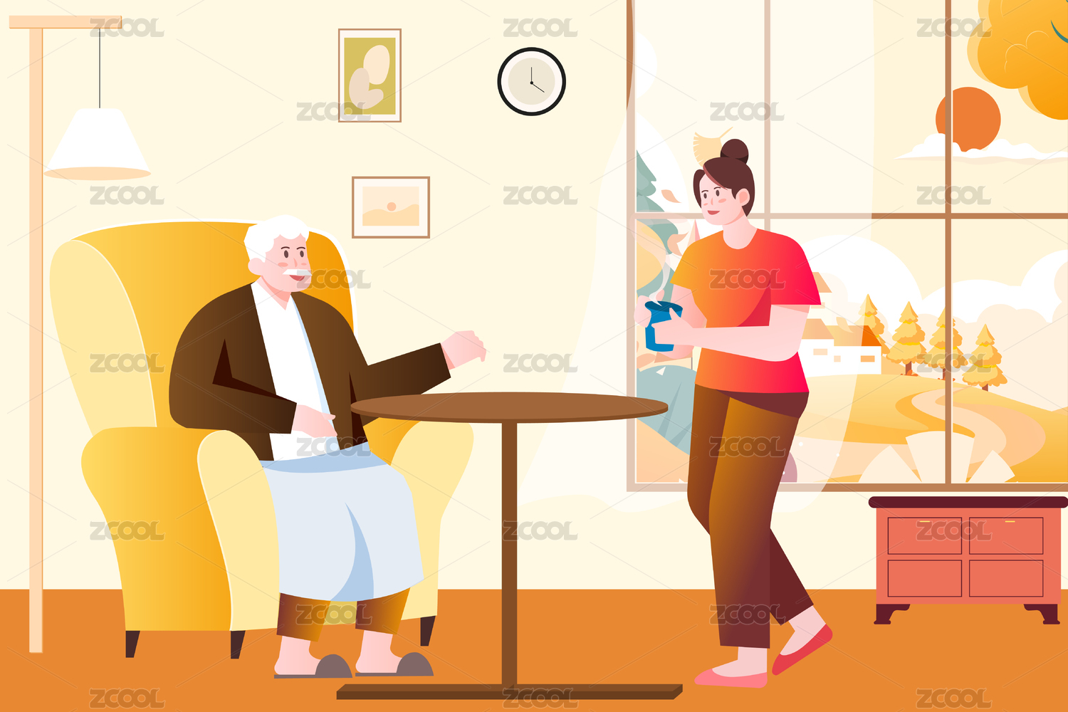 孙女在家中给奶奶端水 可爱风格重阳节孝敬老人插画