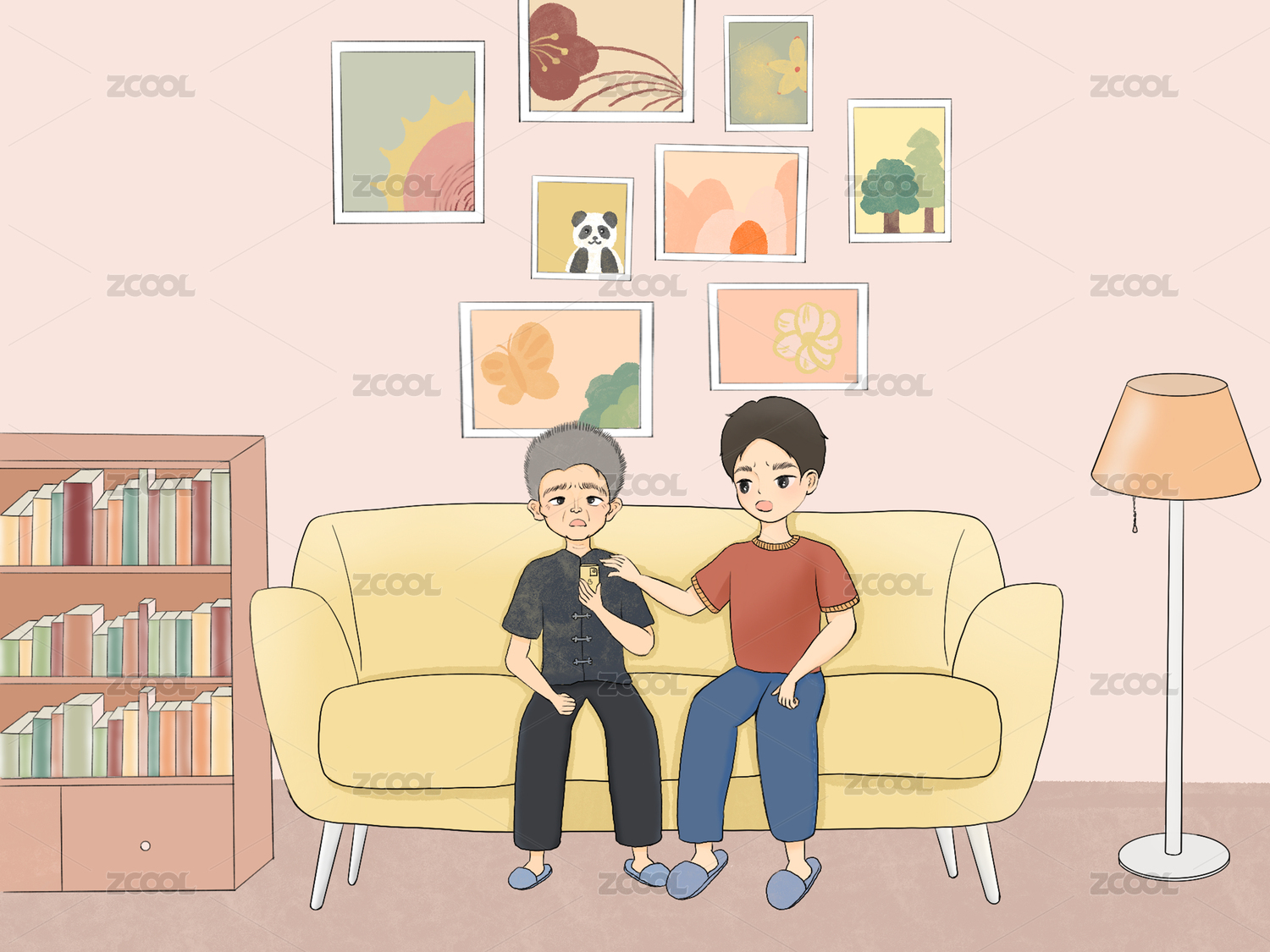 老年人夫妻在家中沙发上相拥 可爱风格重阳节老年人惬意生活插画