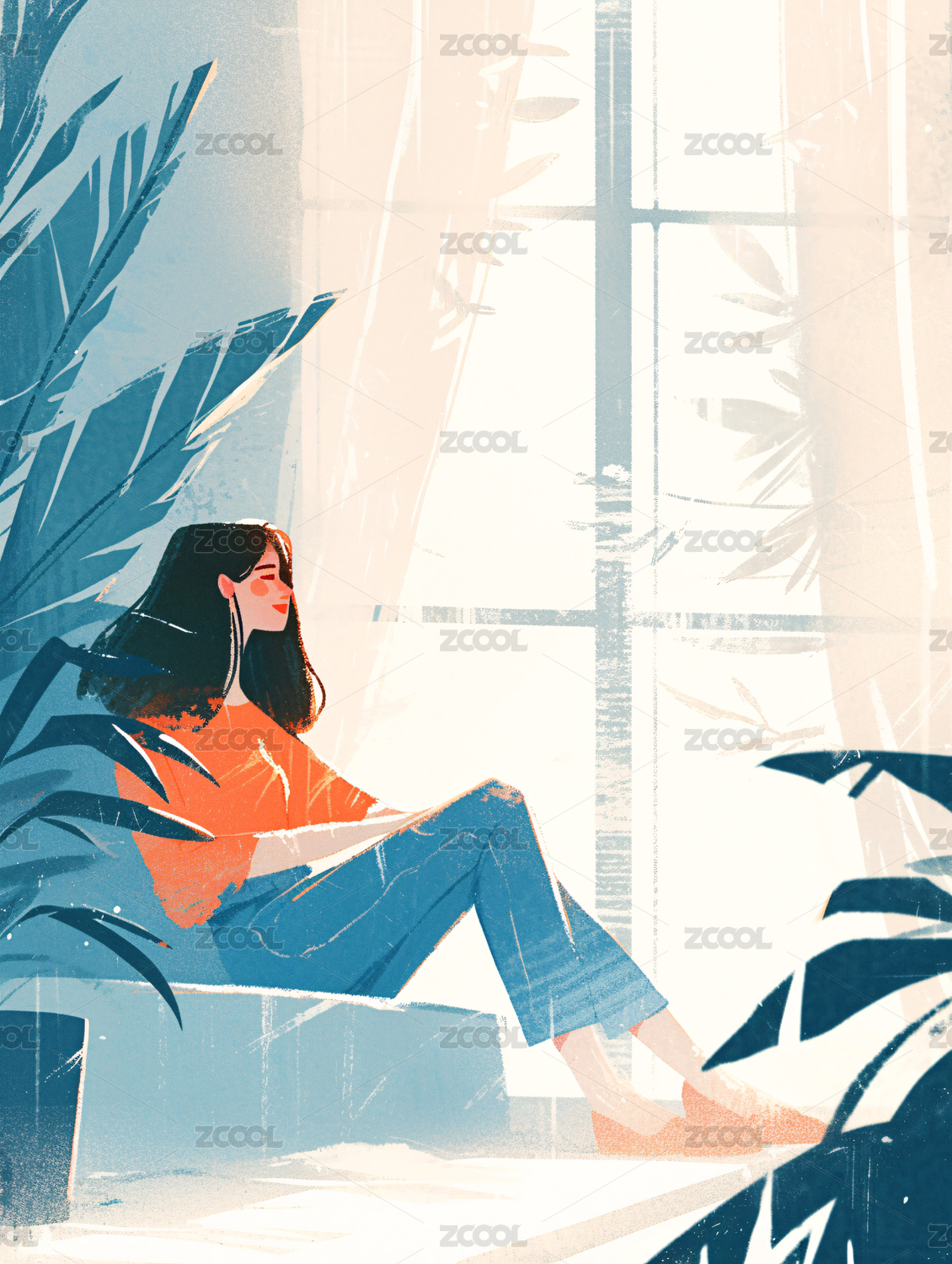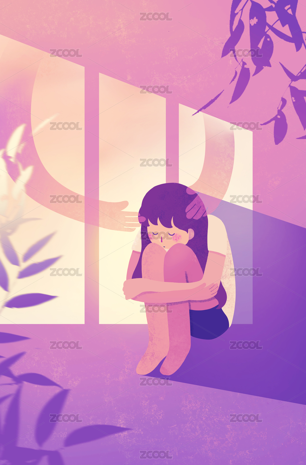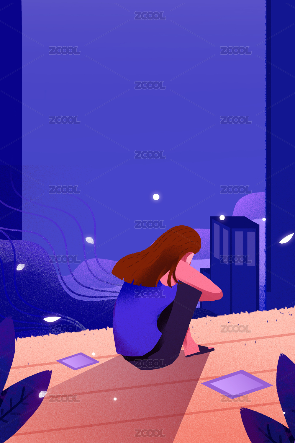 卡通手绘世界自闭日女子孤独抱膝坐插画