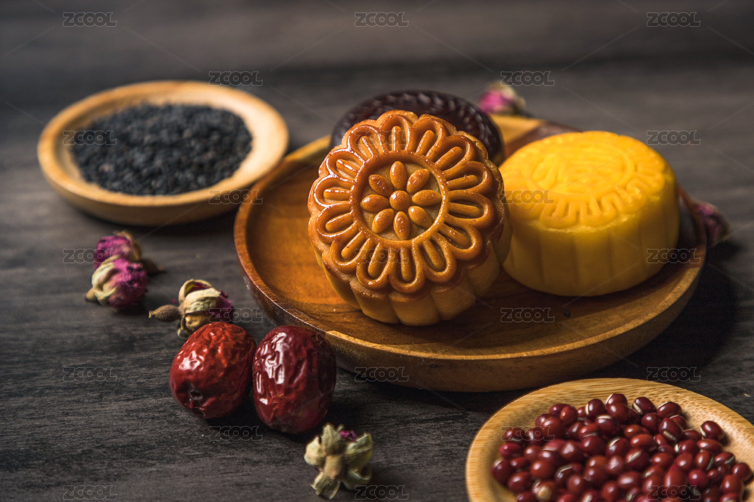 俯视,月饼,黑芝麻,红豆,黑石板,木勺子,玫瑰花,红枣,小麦穗,散落