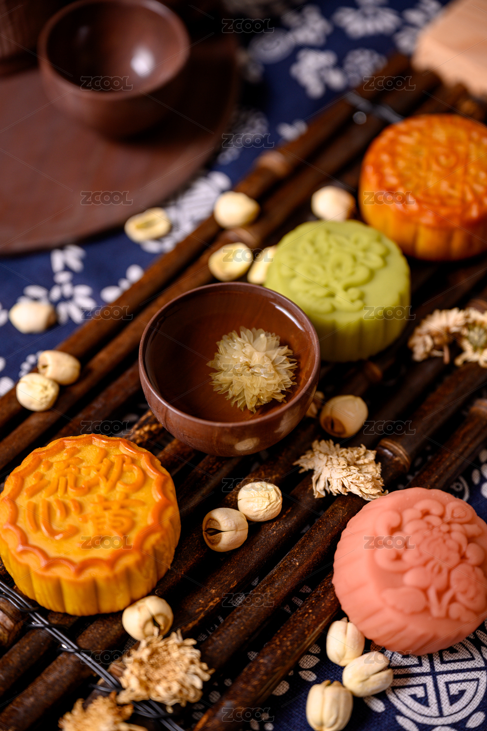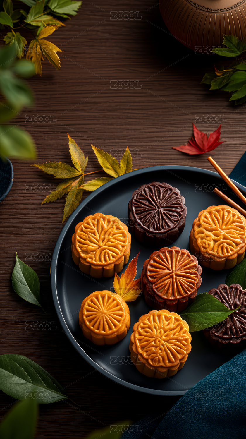 棕色木纹桌上放着几块月饼
