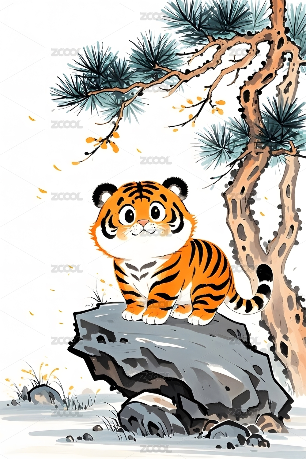 站在岩石上的老虎和松树插画