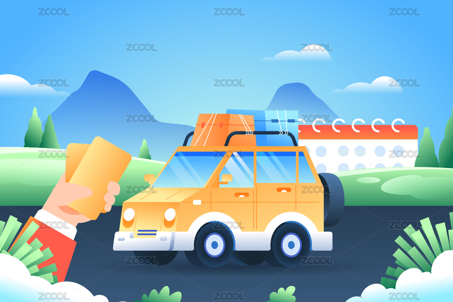 五一劳动节放假开车自驾游出行度假插画