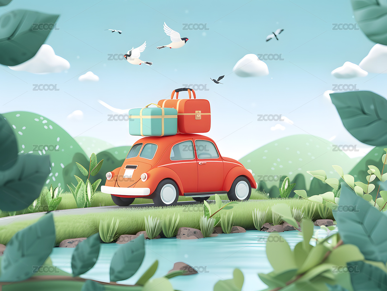 卡通汽车在乡间行驶的旅行场景