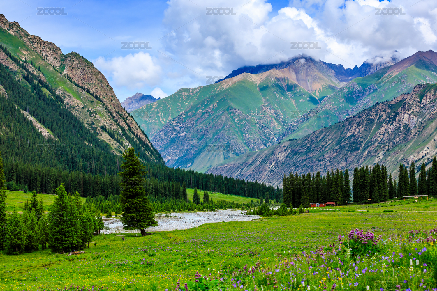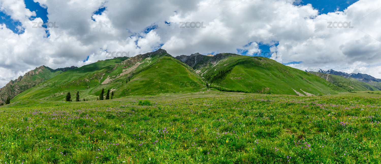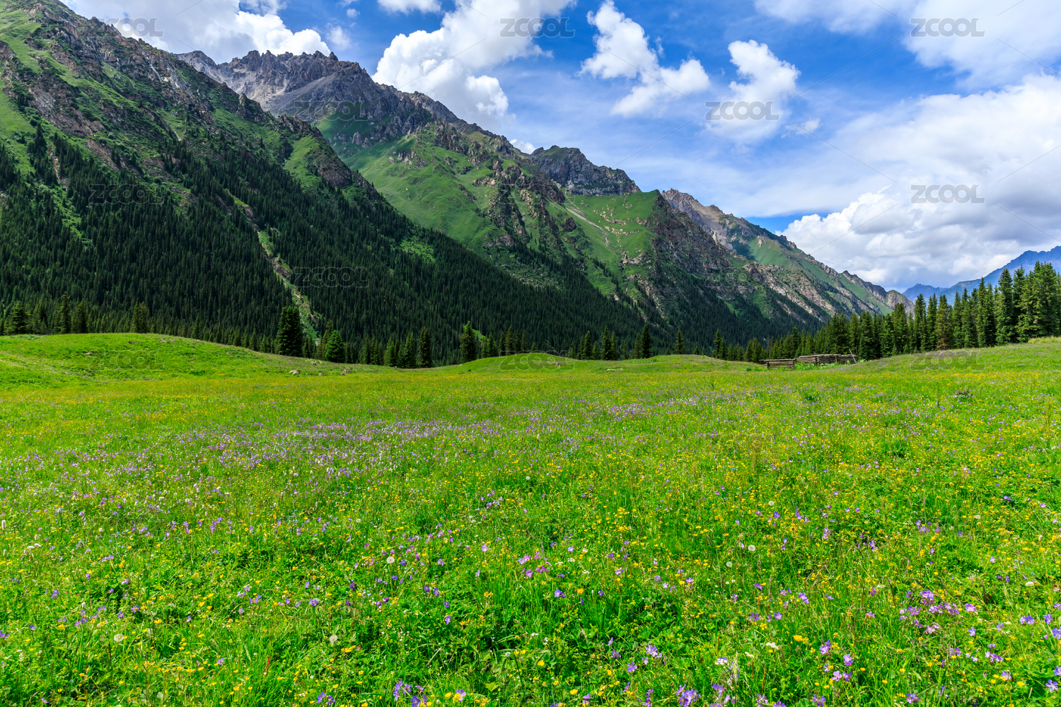 新疆下塔风景区雄伟的山脉和绿色的草原风光