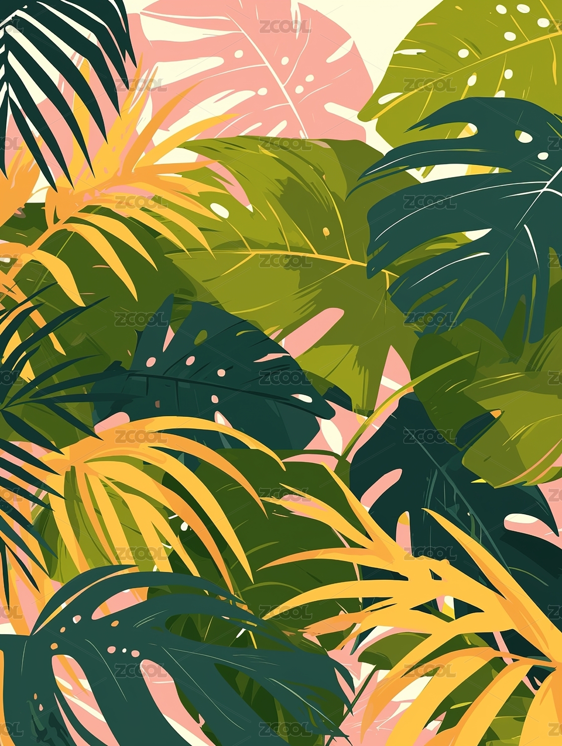 夏天彩色植物叶子四方连续循环无缝拼贴图案