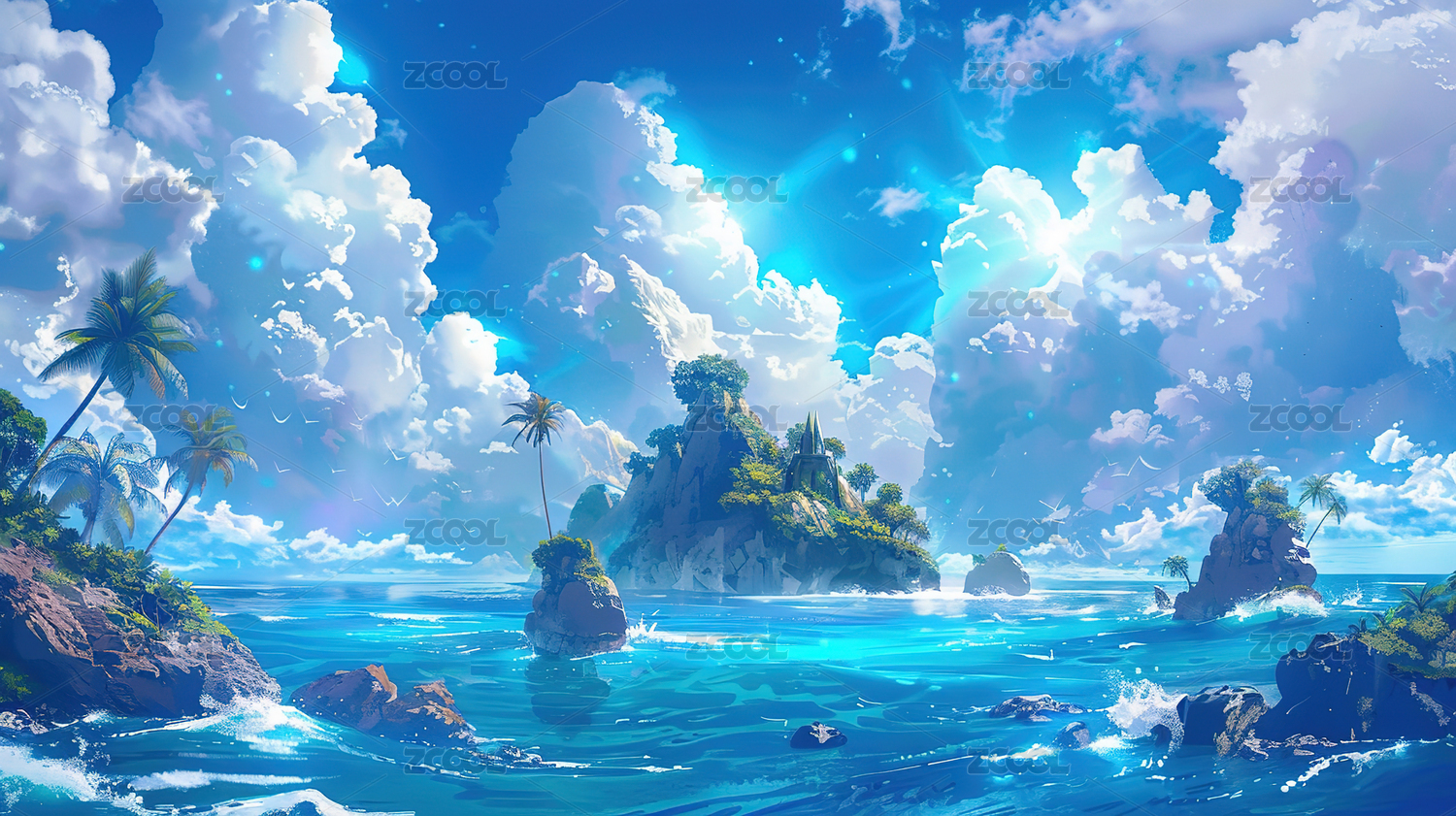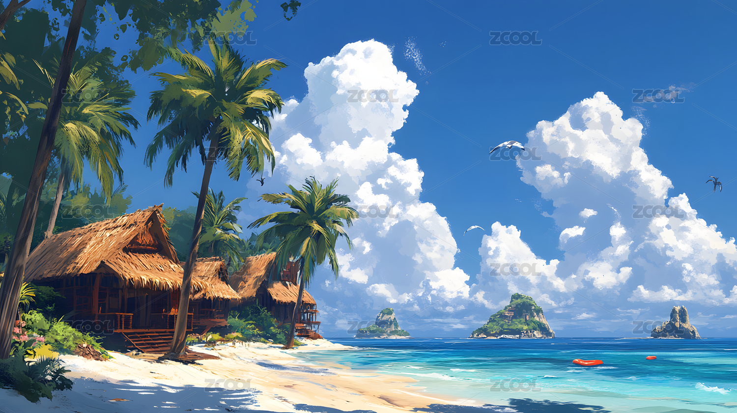 海滩上的树木和建筑物在天空的映衬下尽收眼