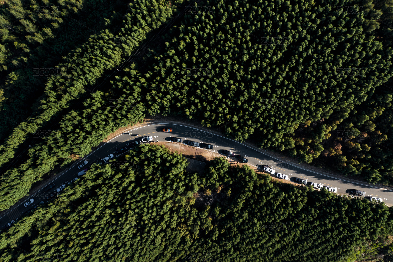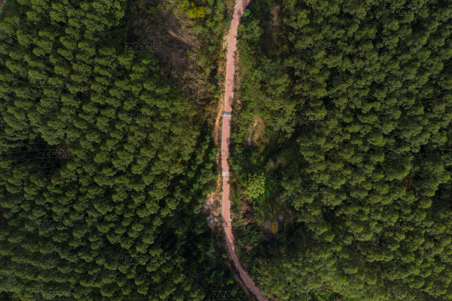 航拍俯视山顶一条弯曲的小路穿越茂密的树木