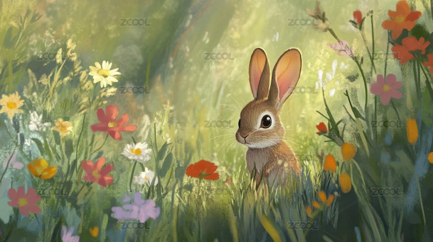 温馨萌宠插画花丛中的兔子