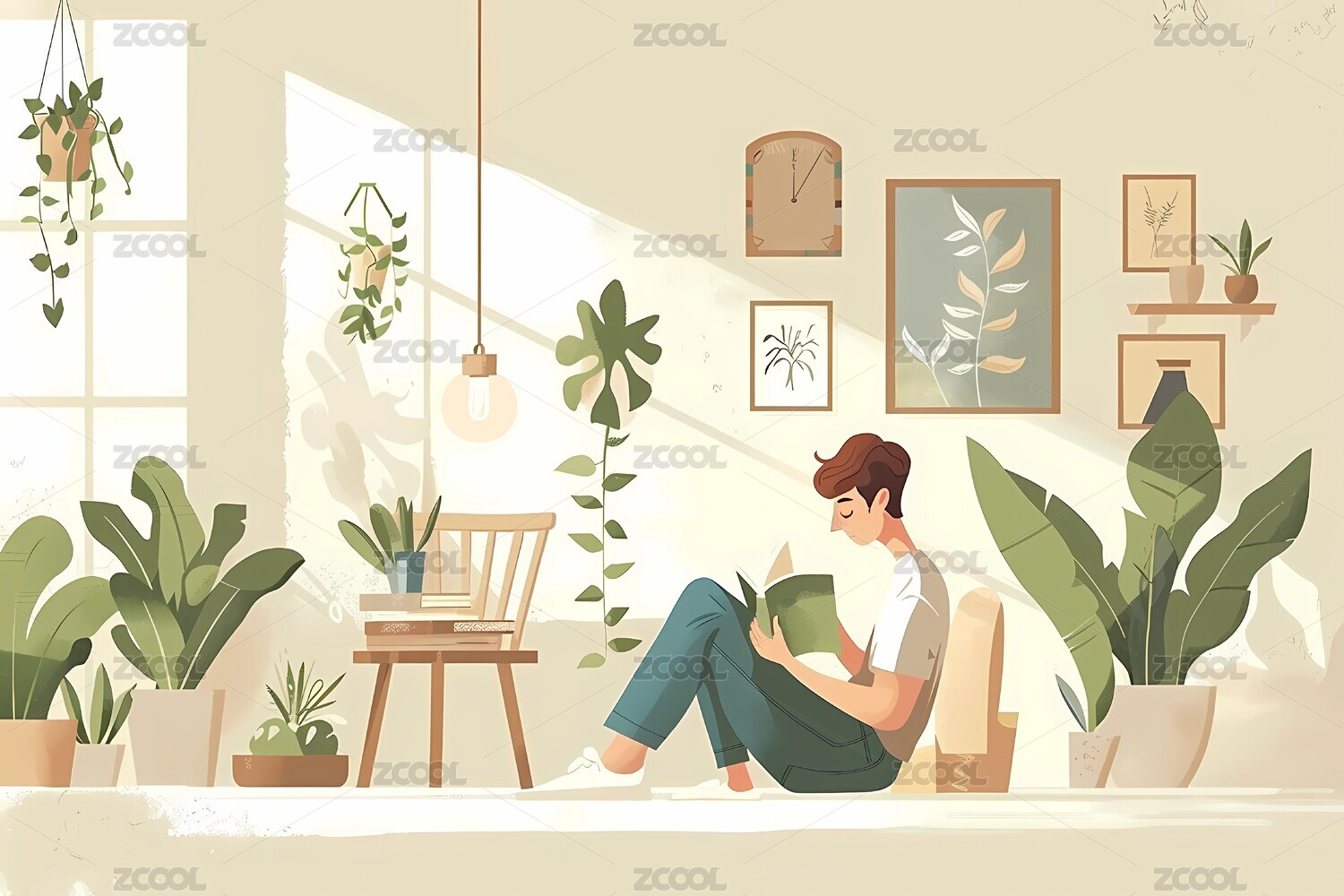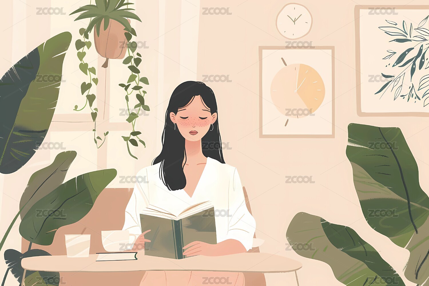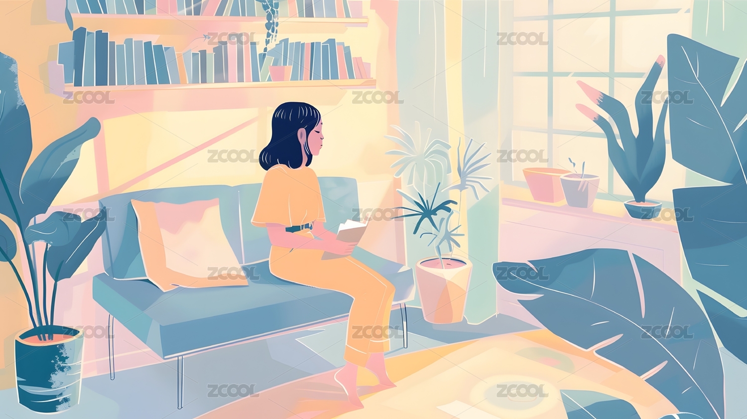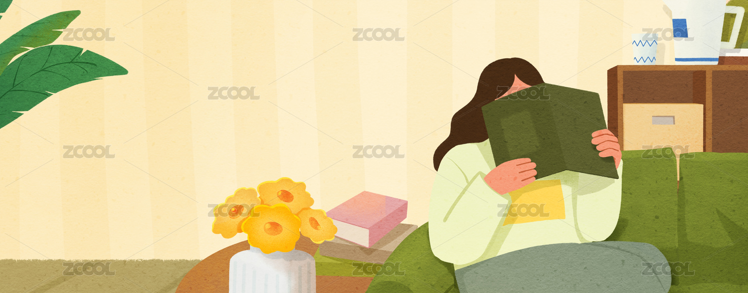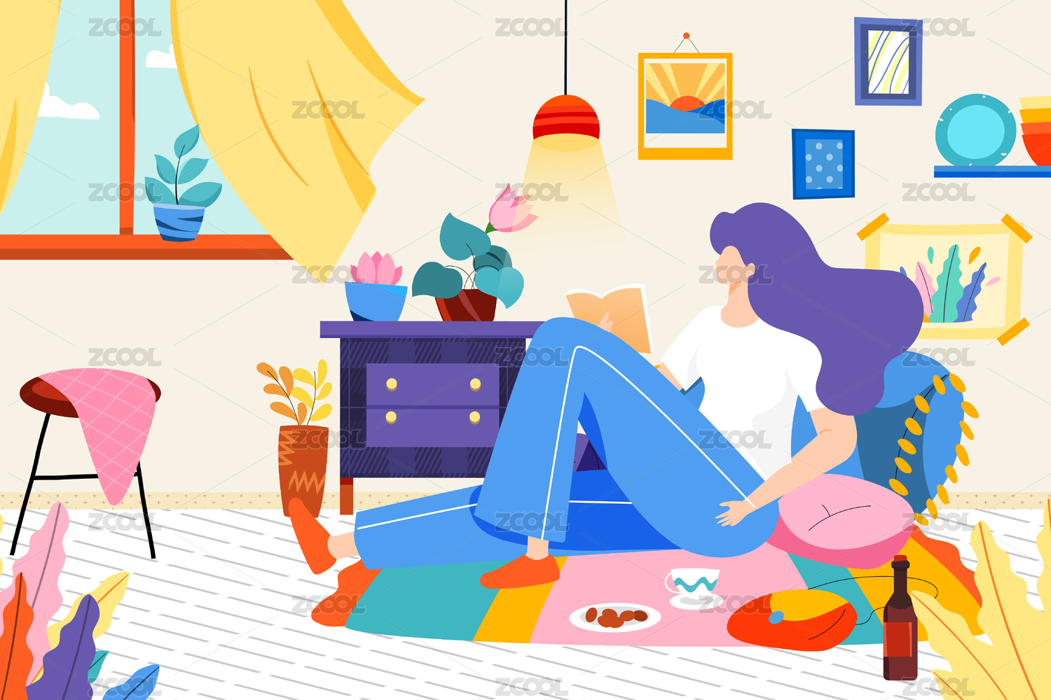 一个女生抱腿坐在地毯上望向远方思考旁边有琴叶榕和书,暖色调插画