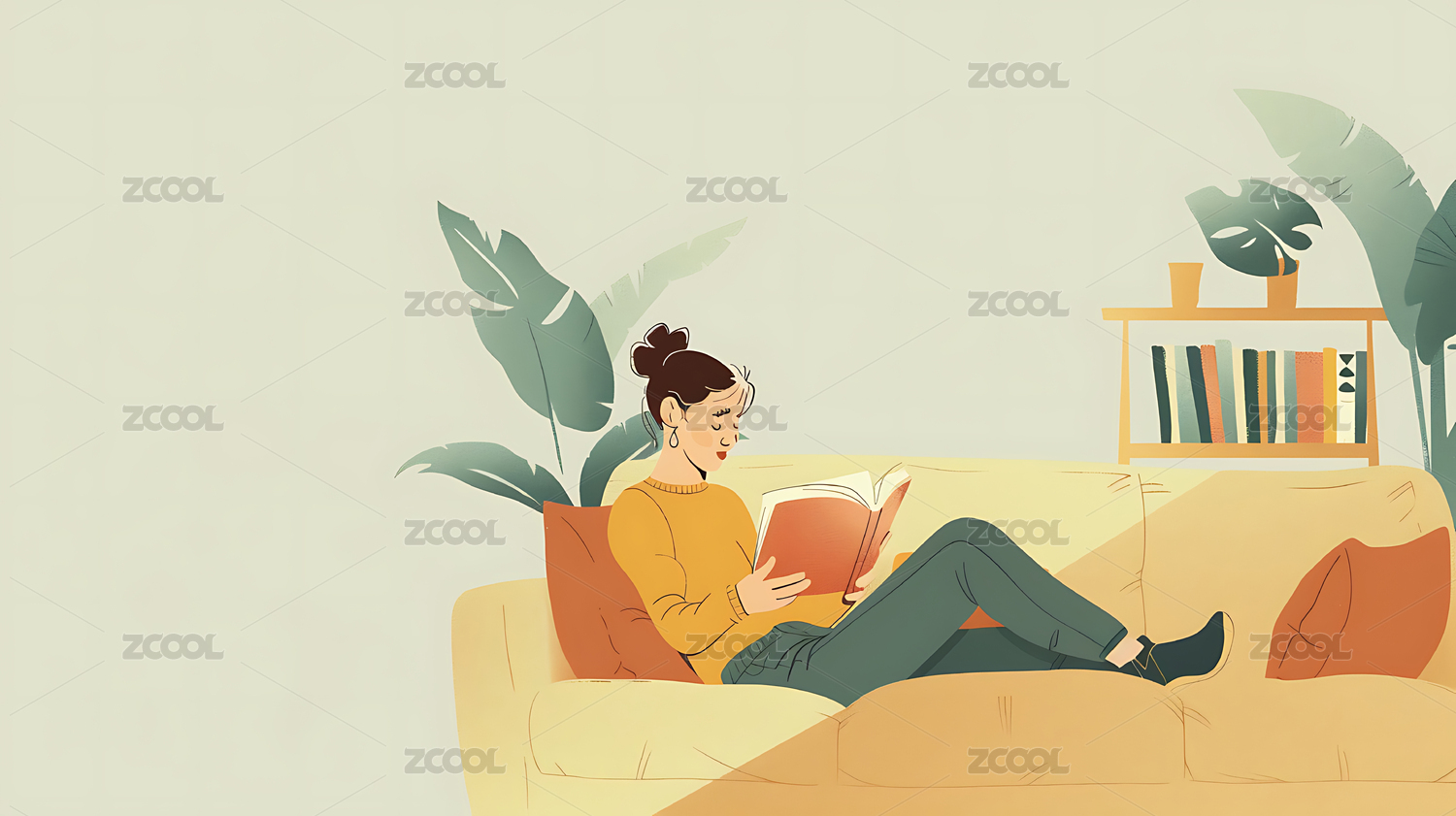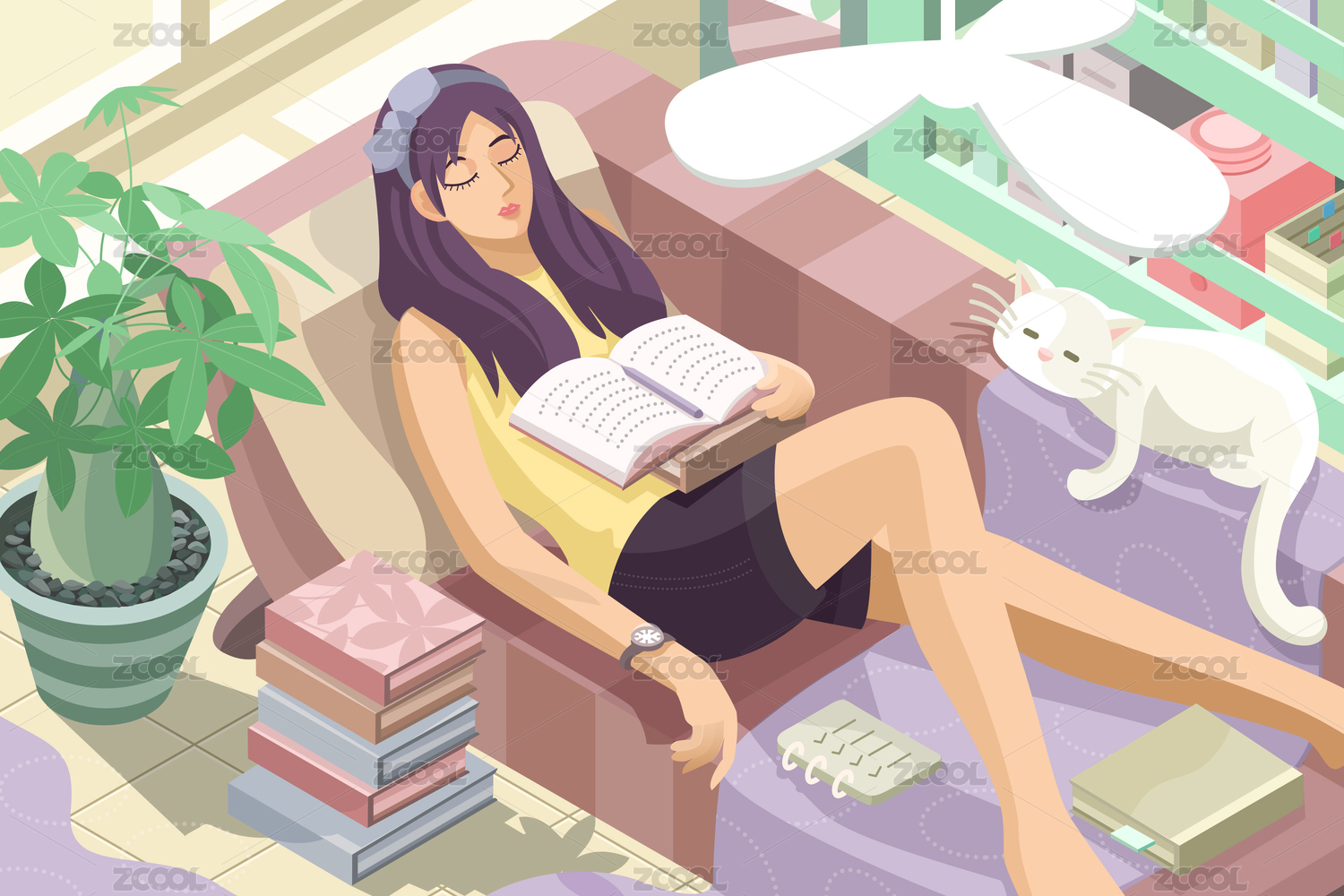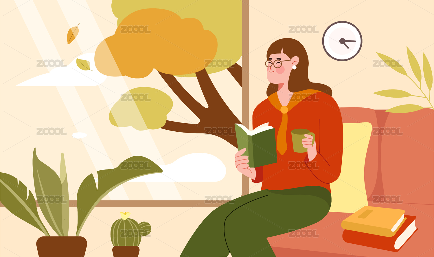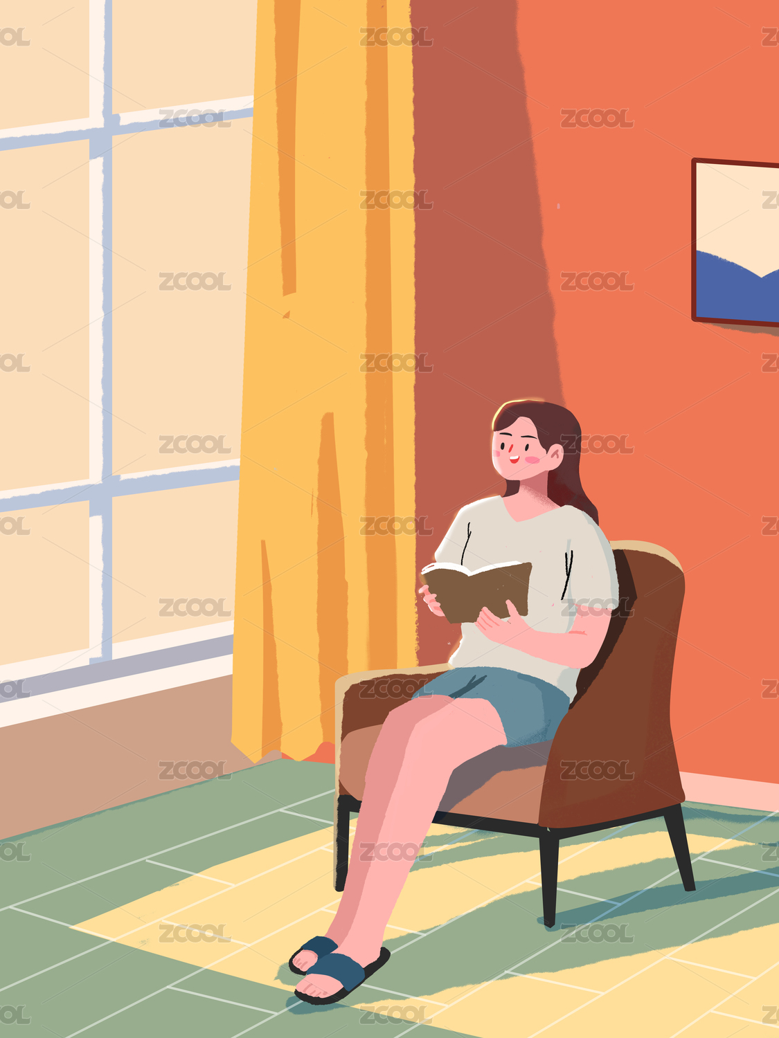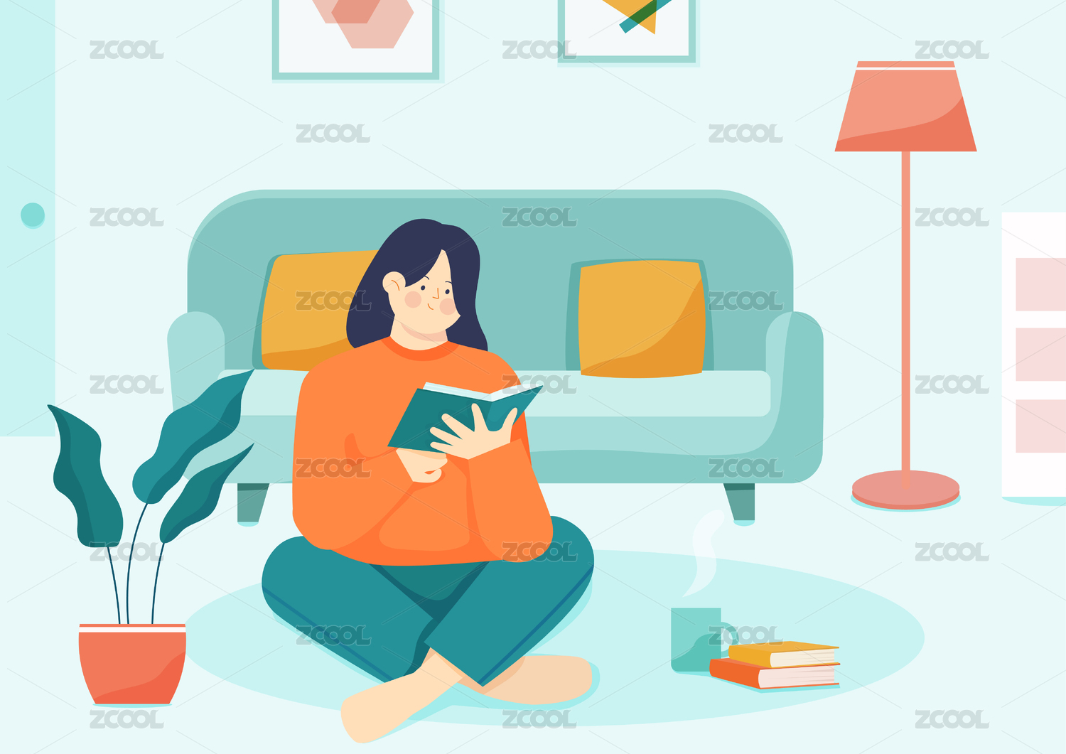 一个女生抱腿坐在地毯上望向远方思考旁边有琴叶榕和书,暖色调插画
