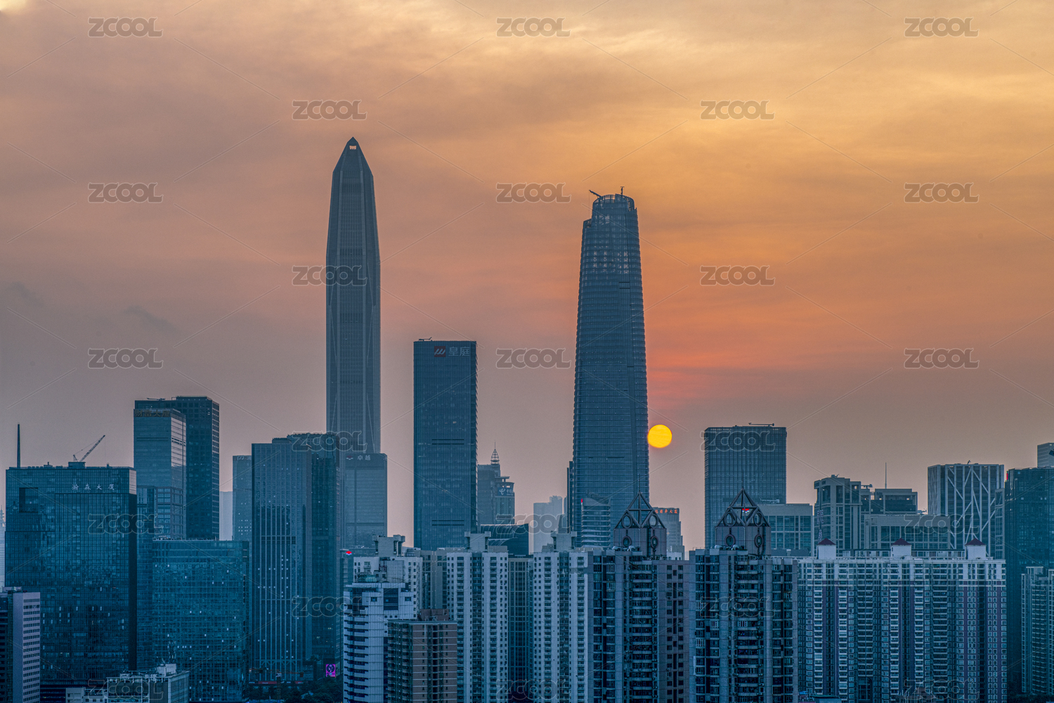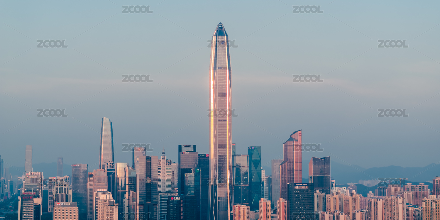 夕阳下的中国广东省深圳平安大厦天际线建筑群风光