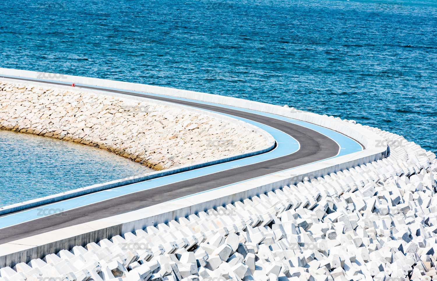 中国天津东疆港海边的混凝土块防波堤航拍图