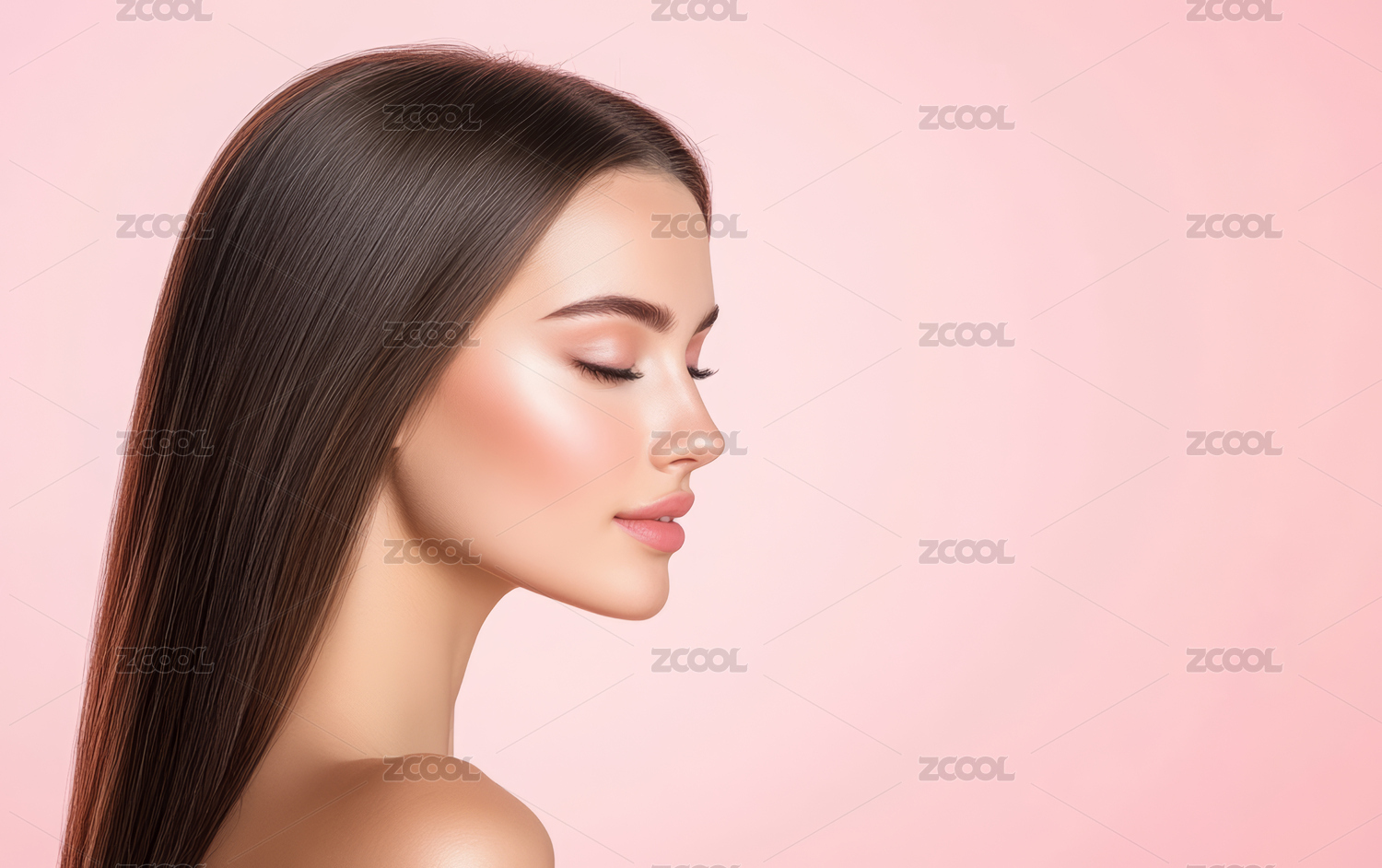 一位棕色长发美女在粉色背景下的侧颜肖像