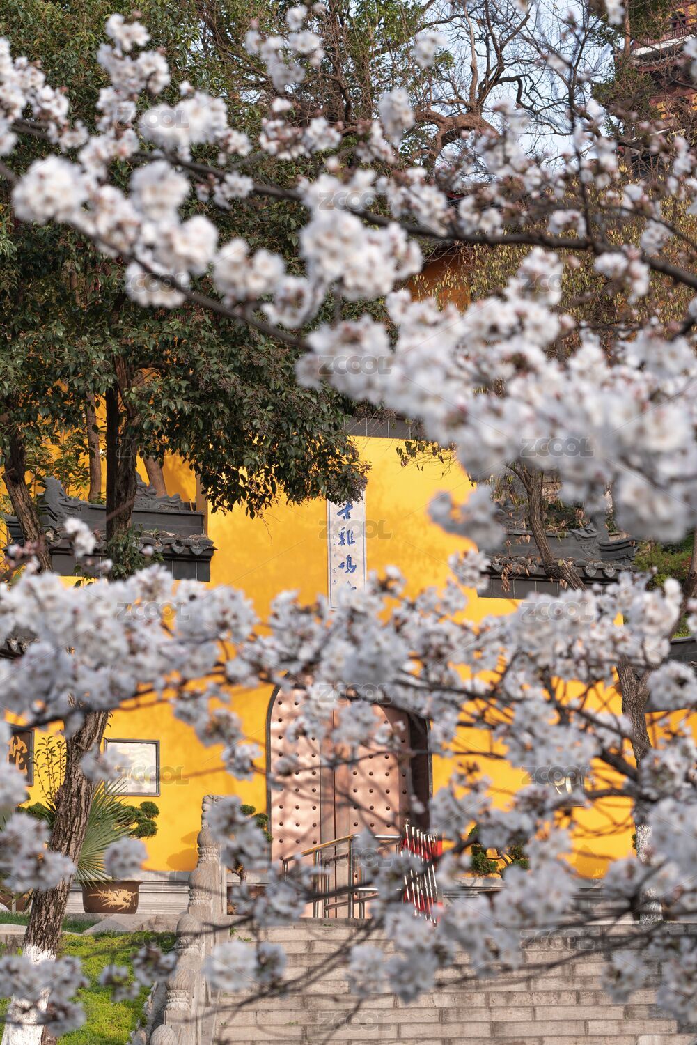 盛开的白色樱花与南京鸡鸣寺的黄色外墙