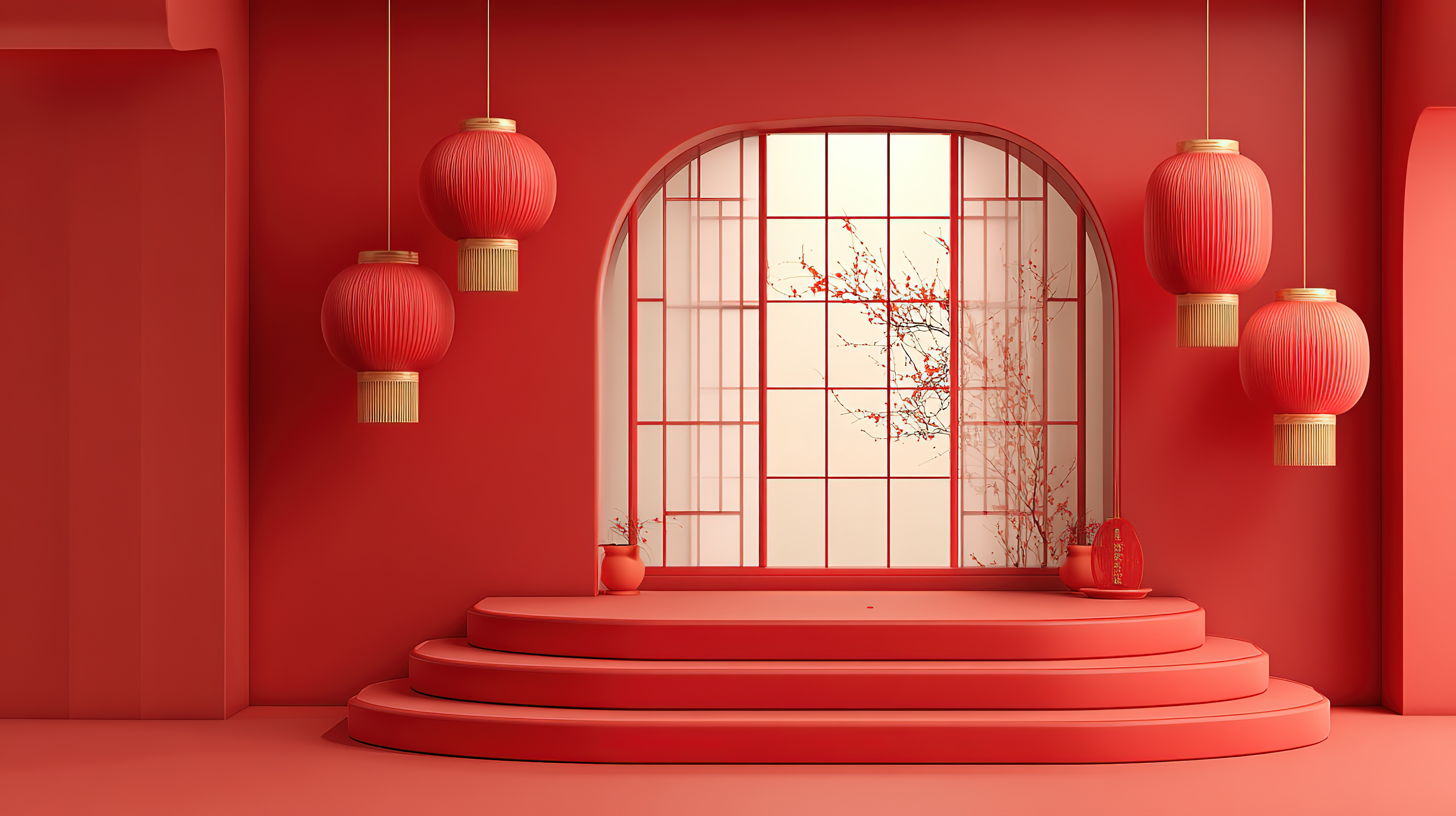 红色主题室内场景灯笼与拱窗装饰