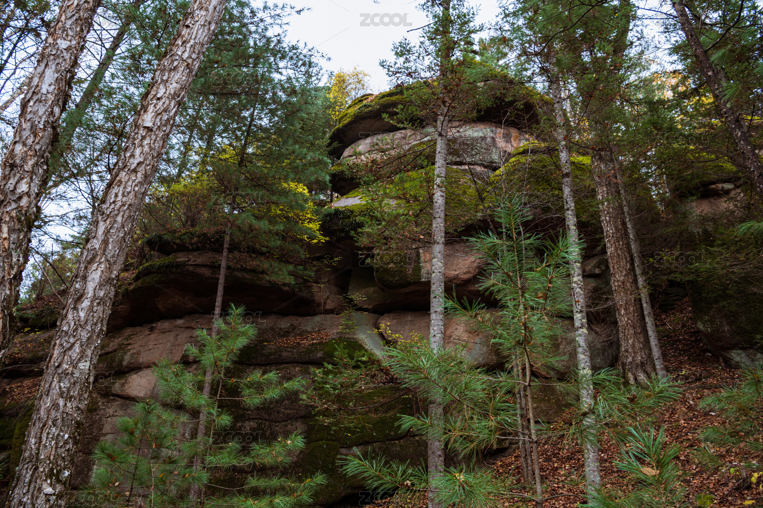 中国大兴安岭金秋苍山石林景区生长着苔藓的奇石与树