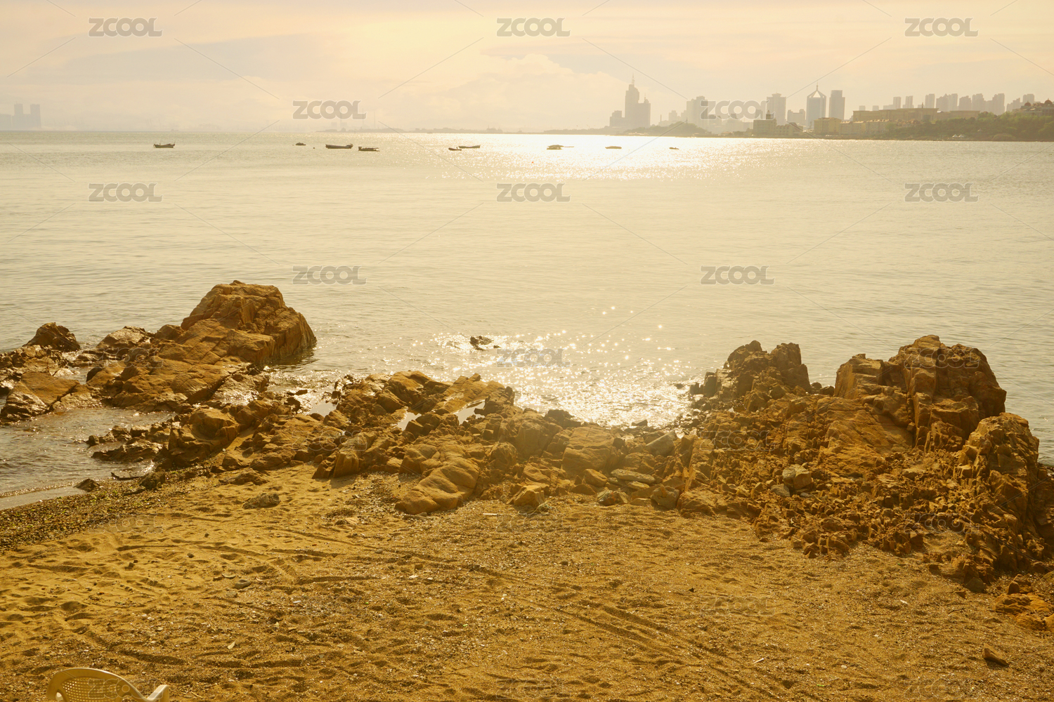 青岛汇泉湾傍晚的海滩礁石和沙滩