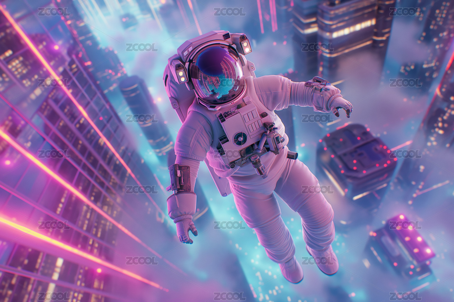 3D卡通风格,一个宇航员漂浮在城市的上空