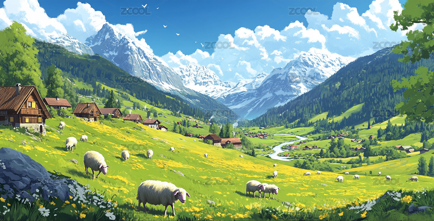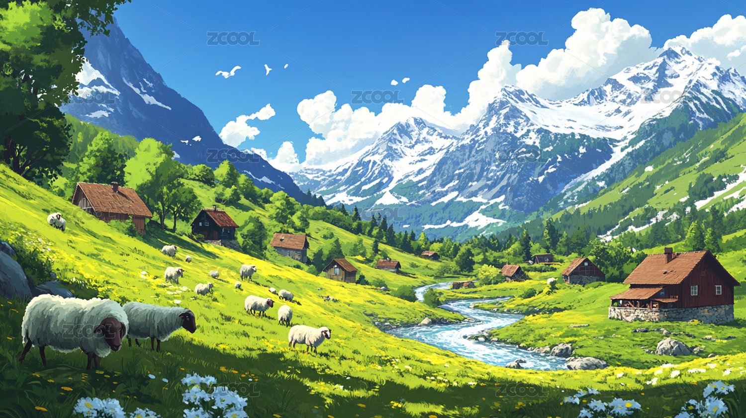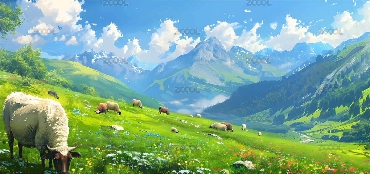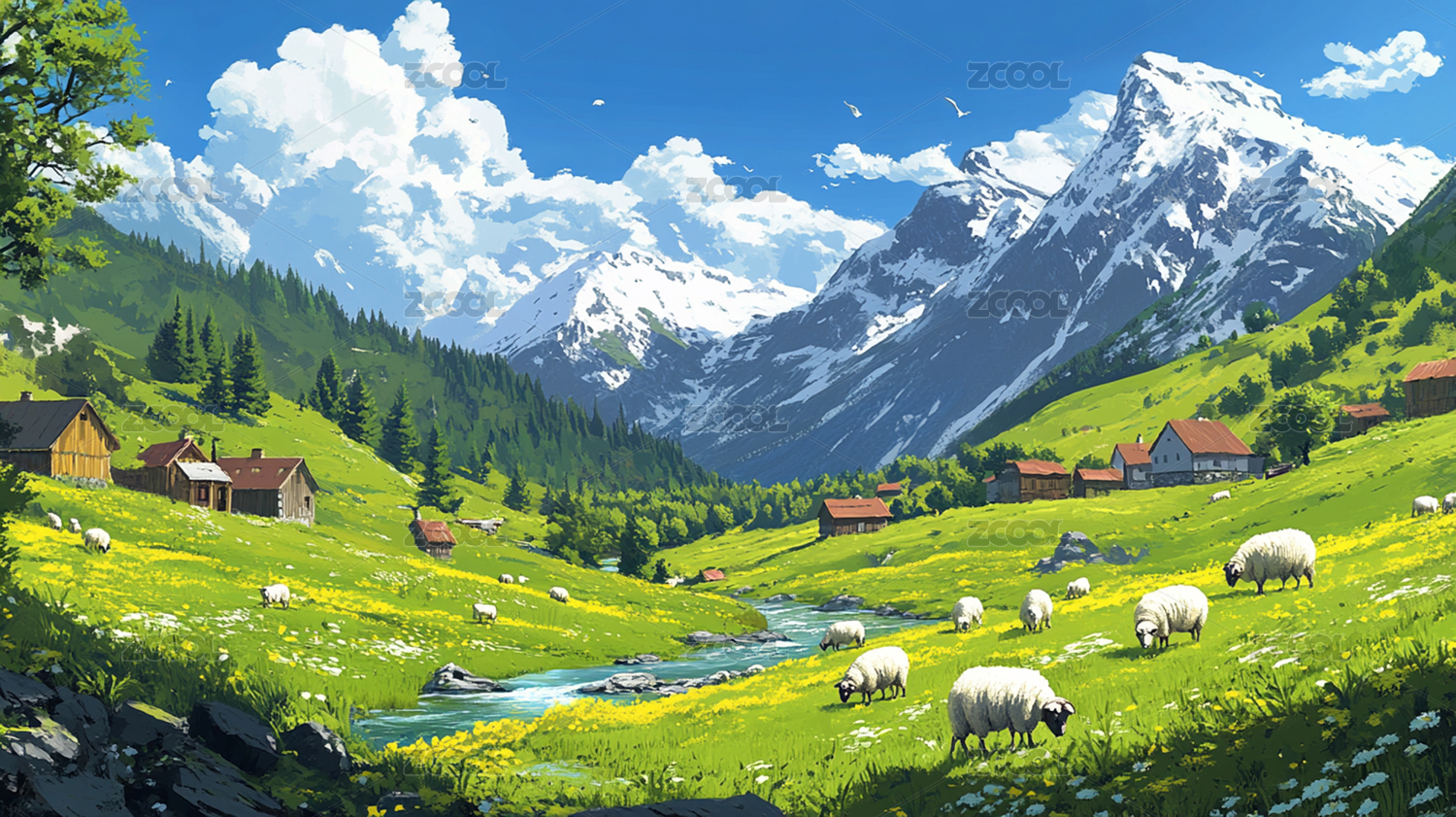 AIGCFG01,蓝天,天空,草地,牧场,卡通,插画,云,风景