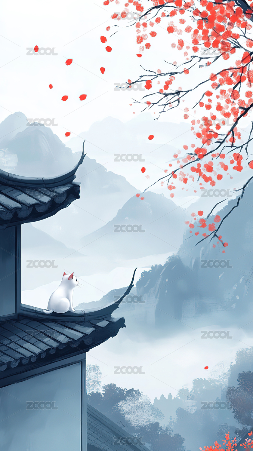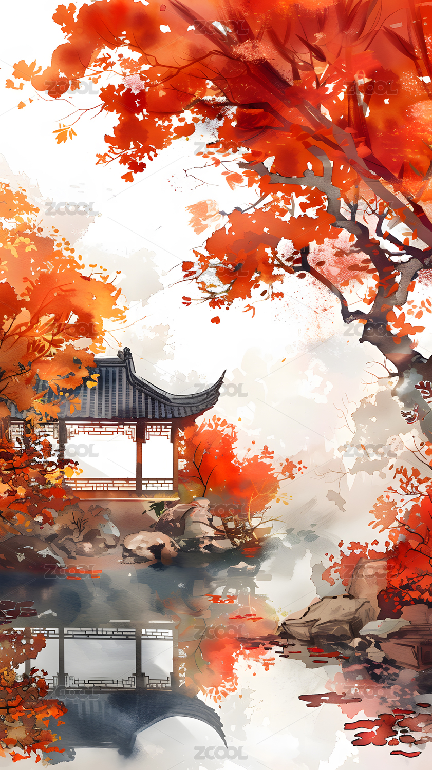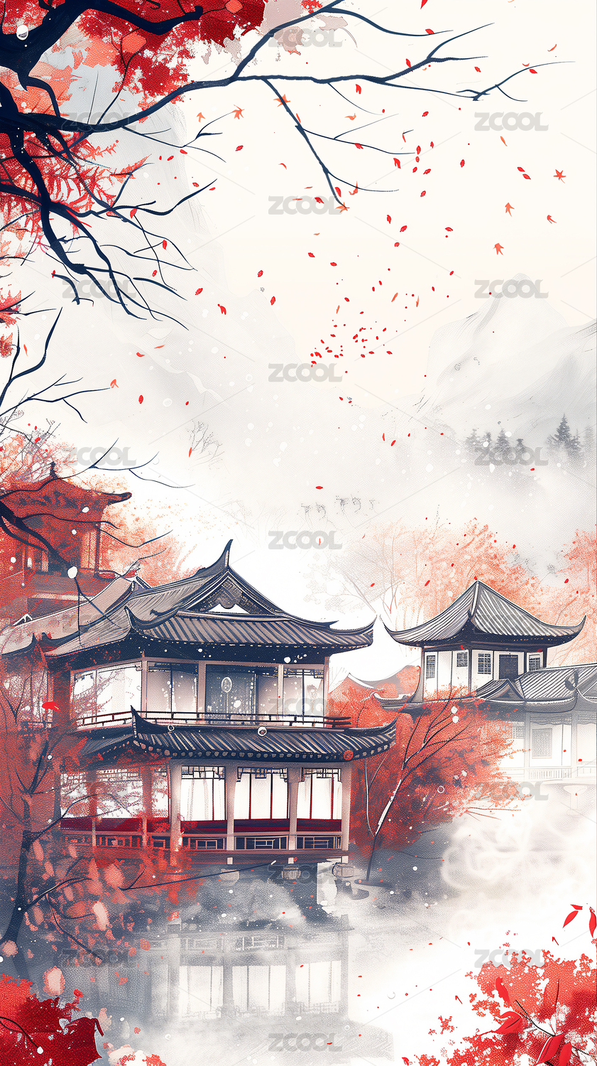 中国风山水建筑自然秋天落叶枫叶插画壁纸