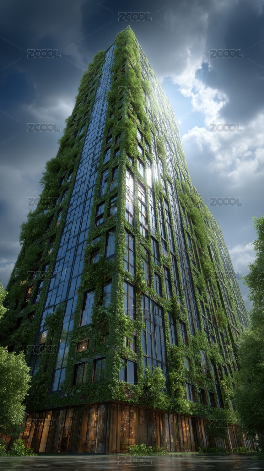 未来建筑绿色植物围绕生态住宅3D立体插画