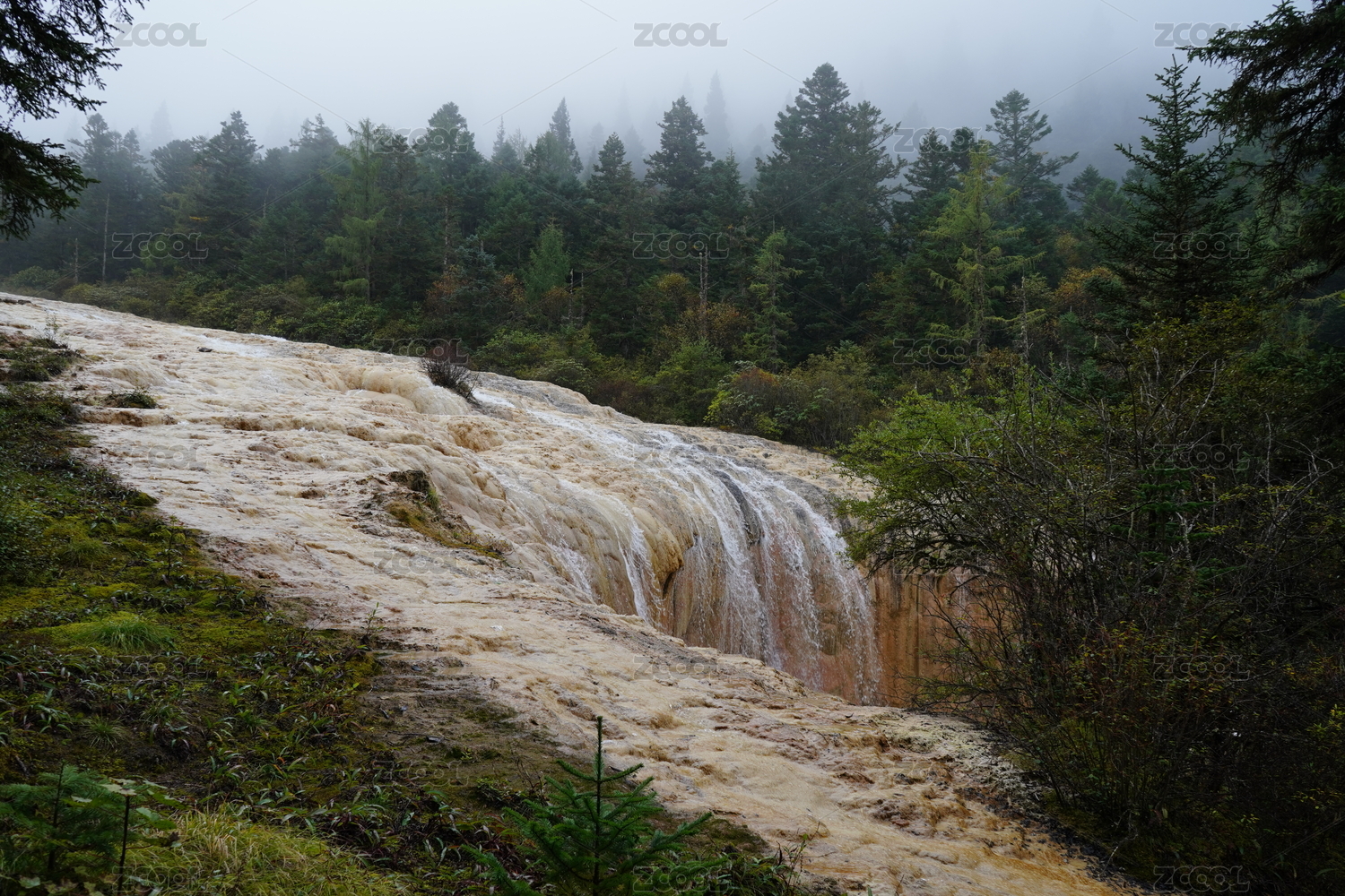 四川松潘县黄龙景区雪山下金黄色钙华沟滩