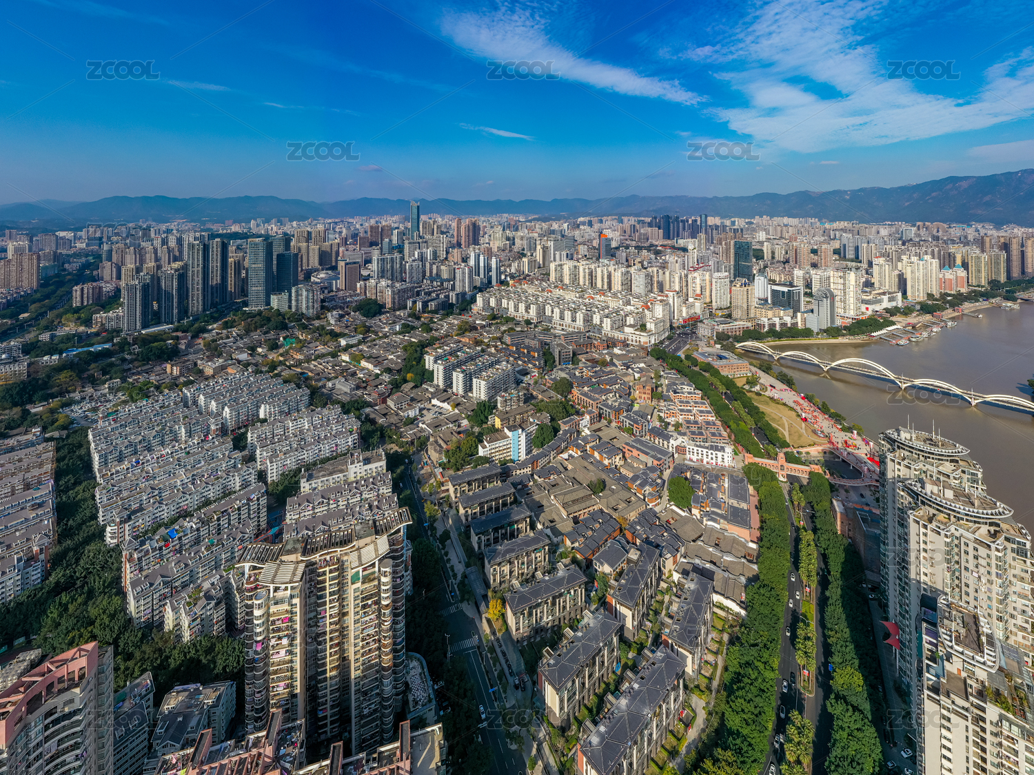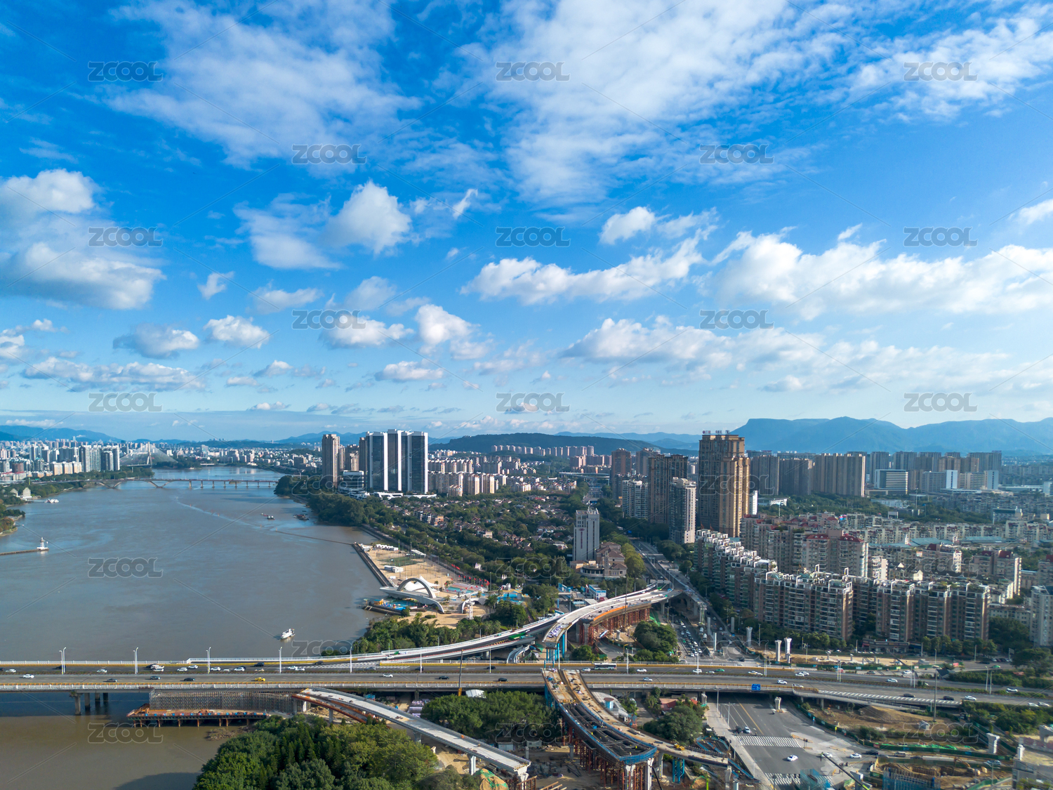 城市,滨海,城市景观,高楼大厦,建筑,河流,桥梁,阳光,白云,蓝天