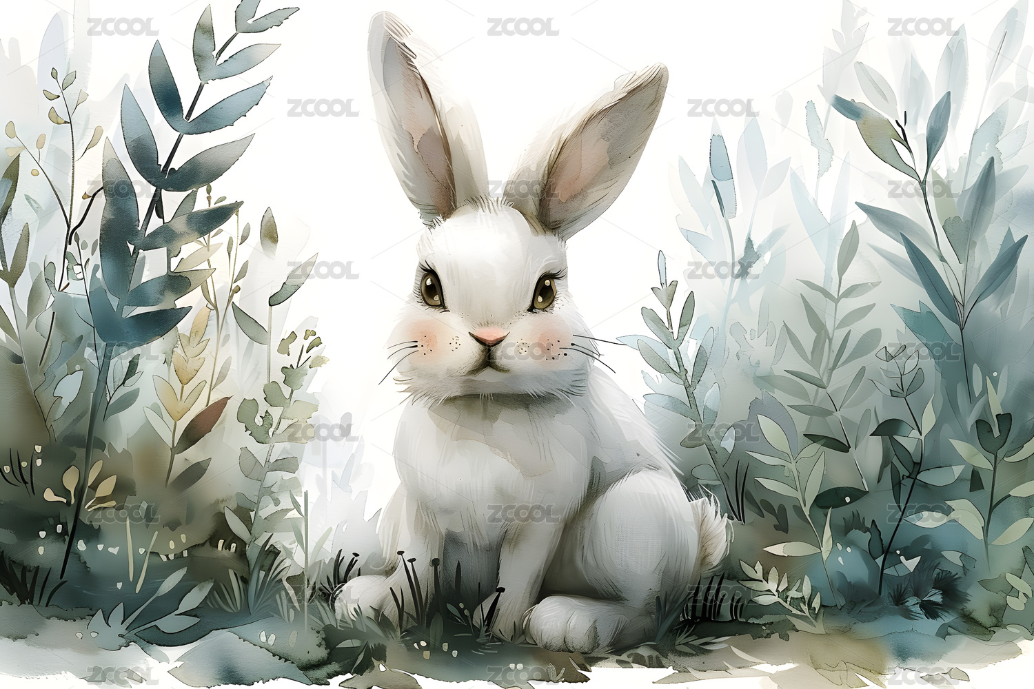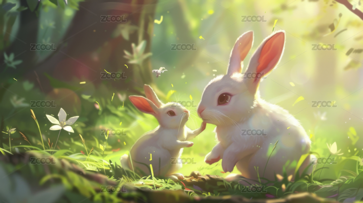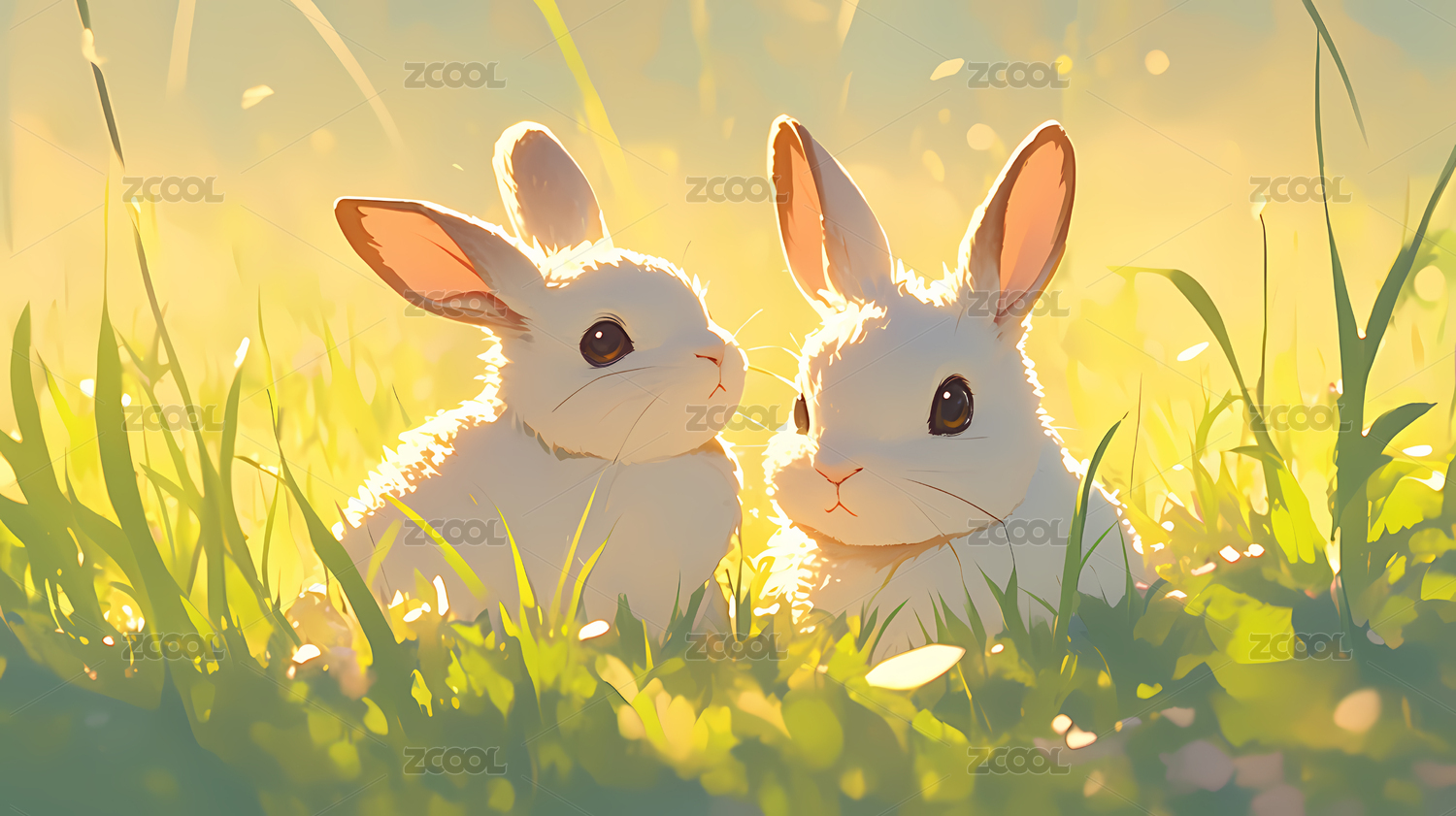 两只可爱的卡通兔子在草地上动物插画壁纸