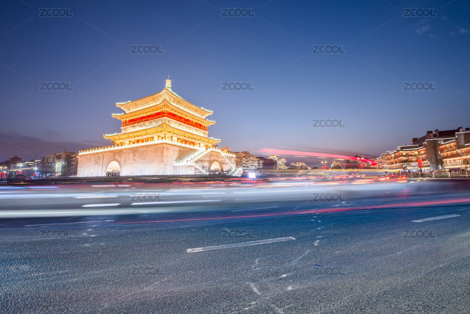 西安古建筑钟楼夜景与汽车尾灯灯带