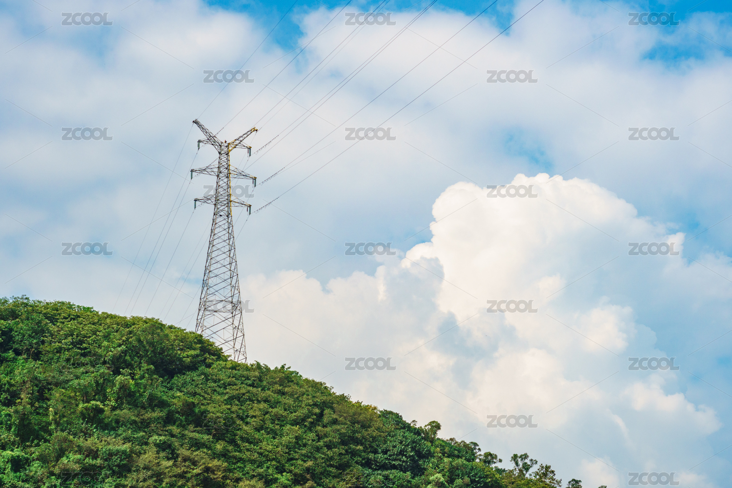蓝天白云下植被茂密的山顶一个高压电线塔架