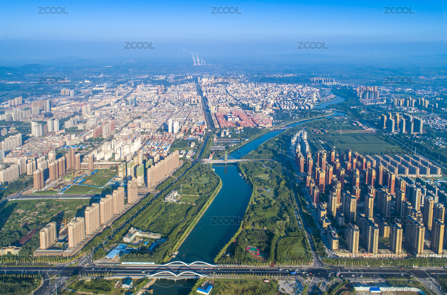 航拍中国河南禹州市颍河上的桥和两岸景观