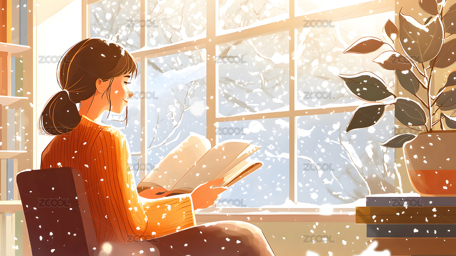 冬日雪景:女孩沙发读书,猫咪依偎身旁