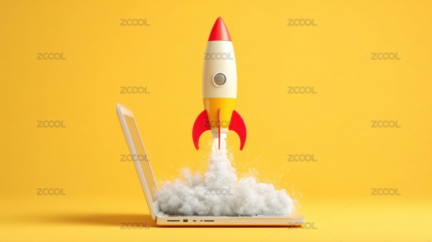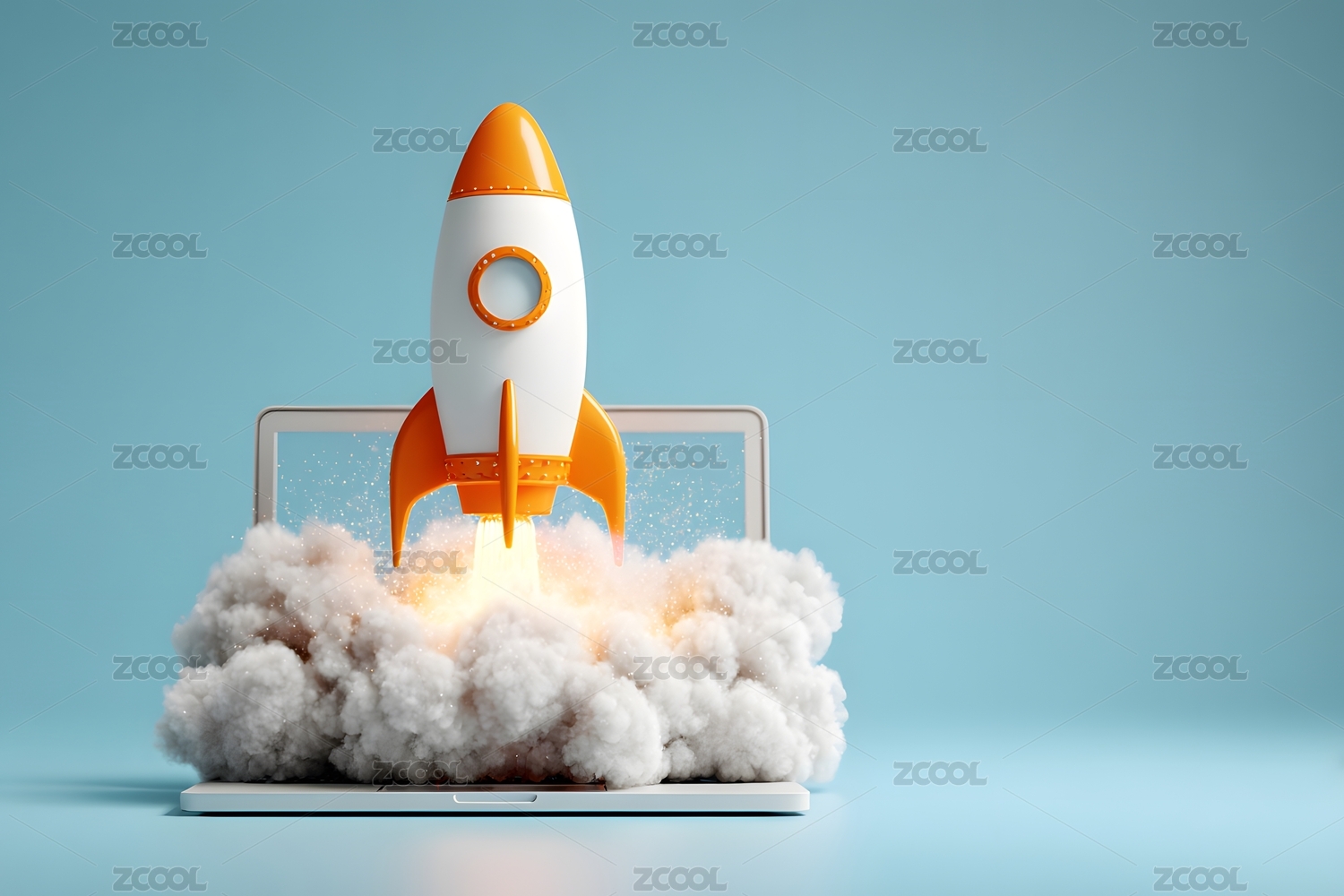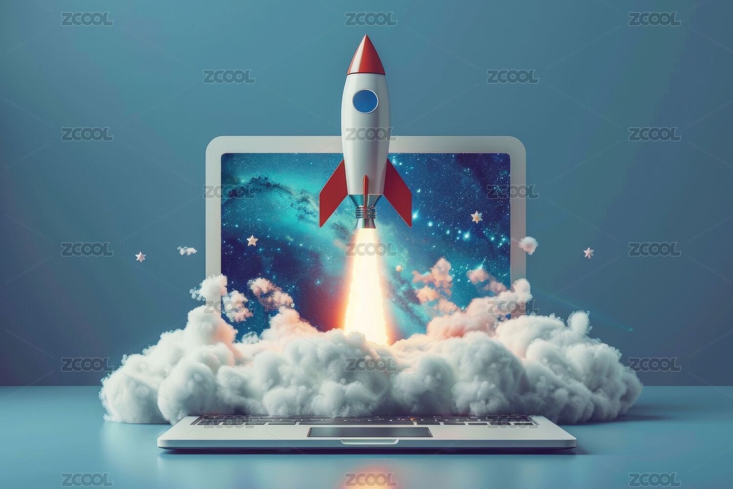 火箭发射电脑屏幕启动飞翔蓝色背景