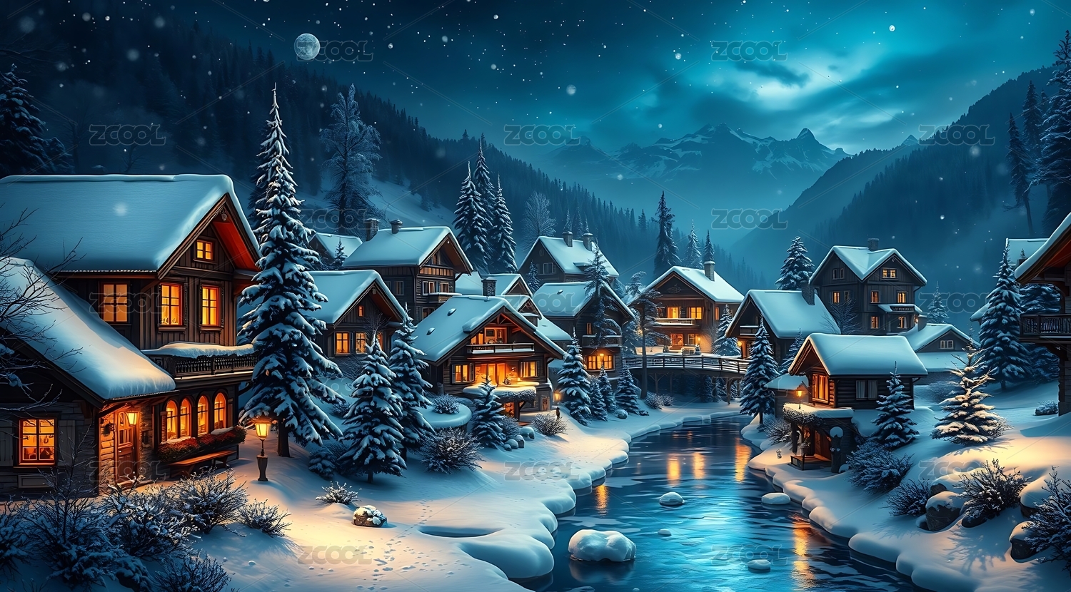冬天,雪地,房屋,灯光,树木,松树,山脉,夜晚,星星,月亮