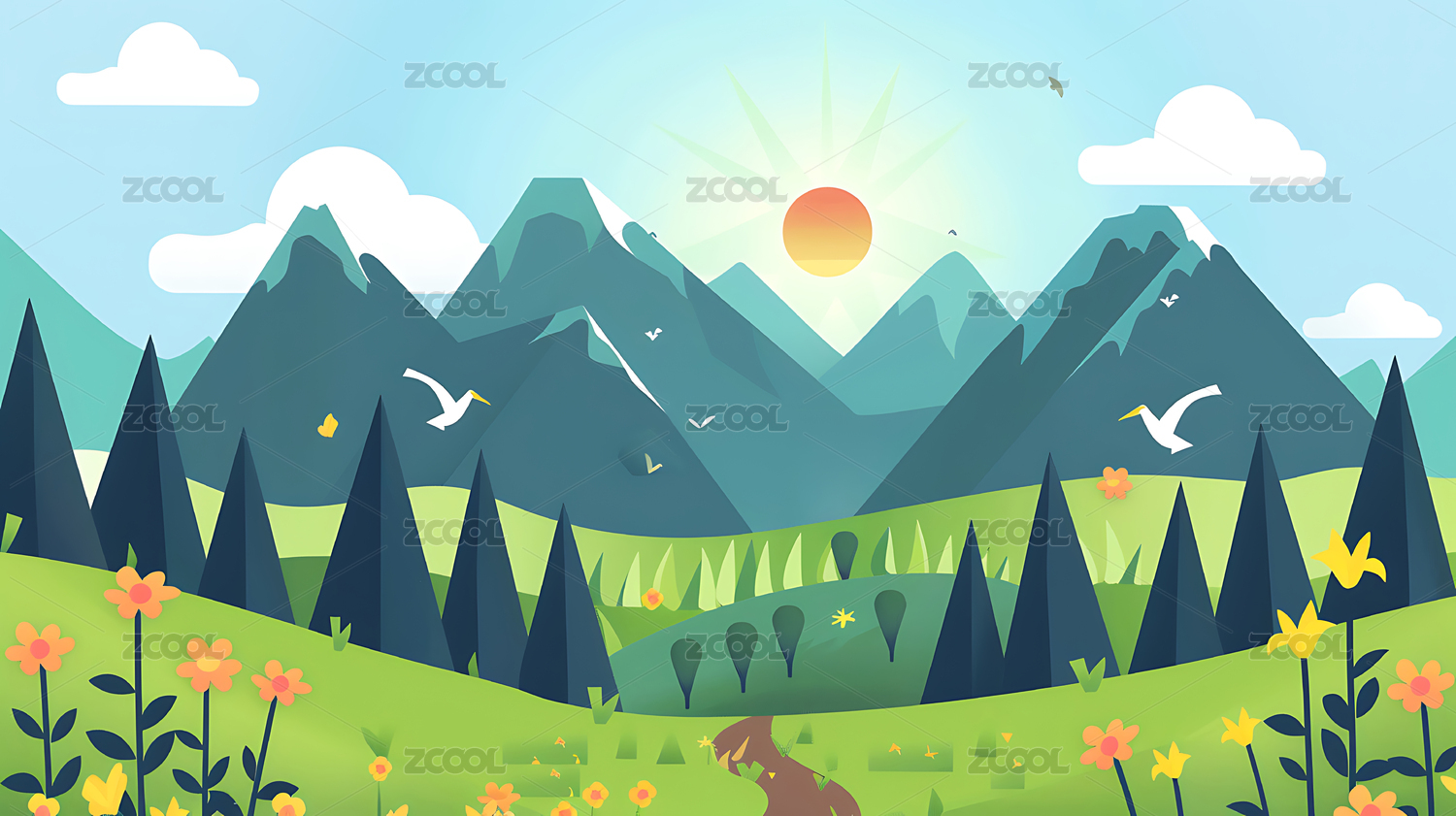 卡通立春踏青春季瀑布自然风景背景矢量插画