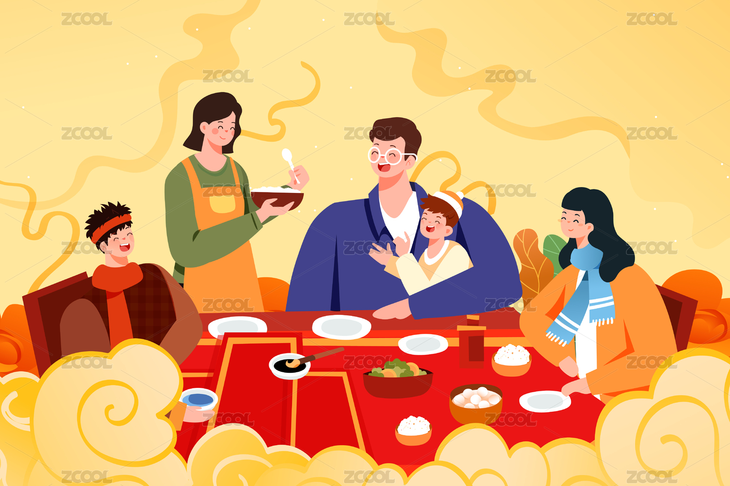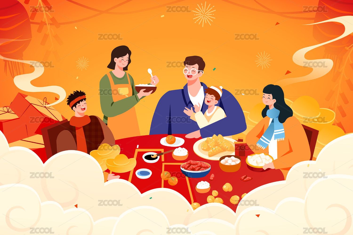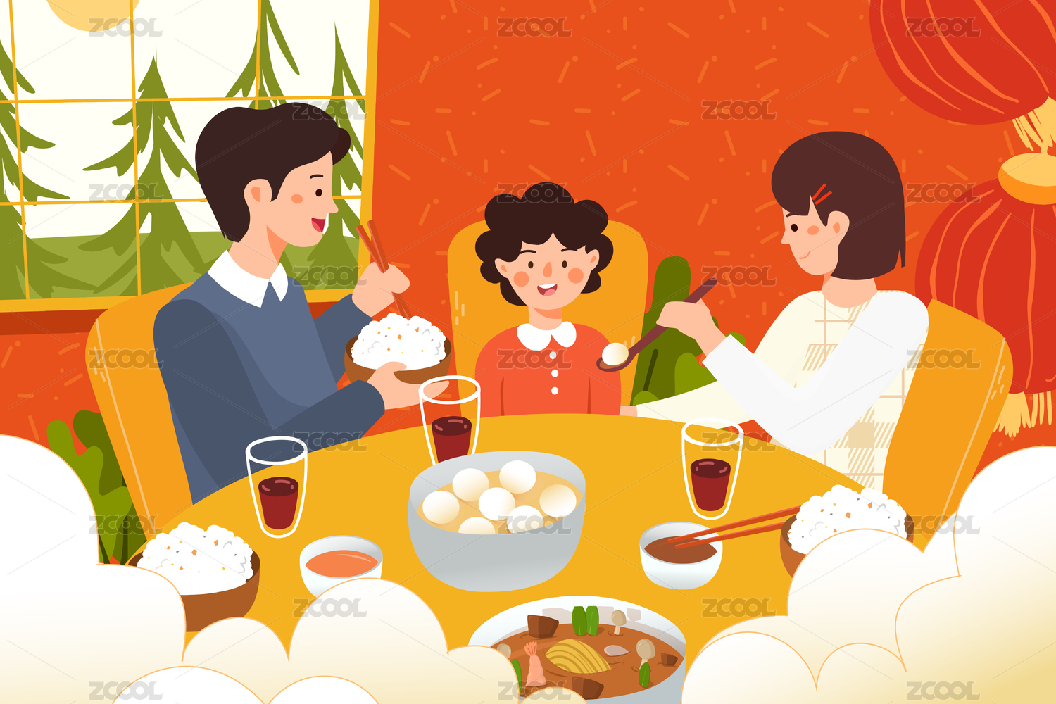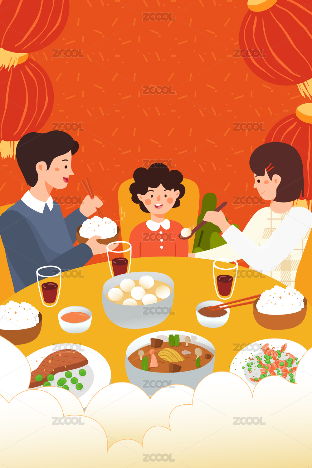 卡通新年春节年夜饭团圆饭吃饭家人团圆背景矢量插画