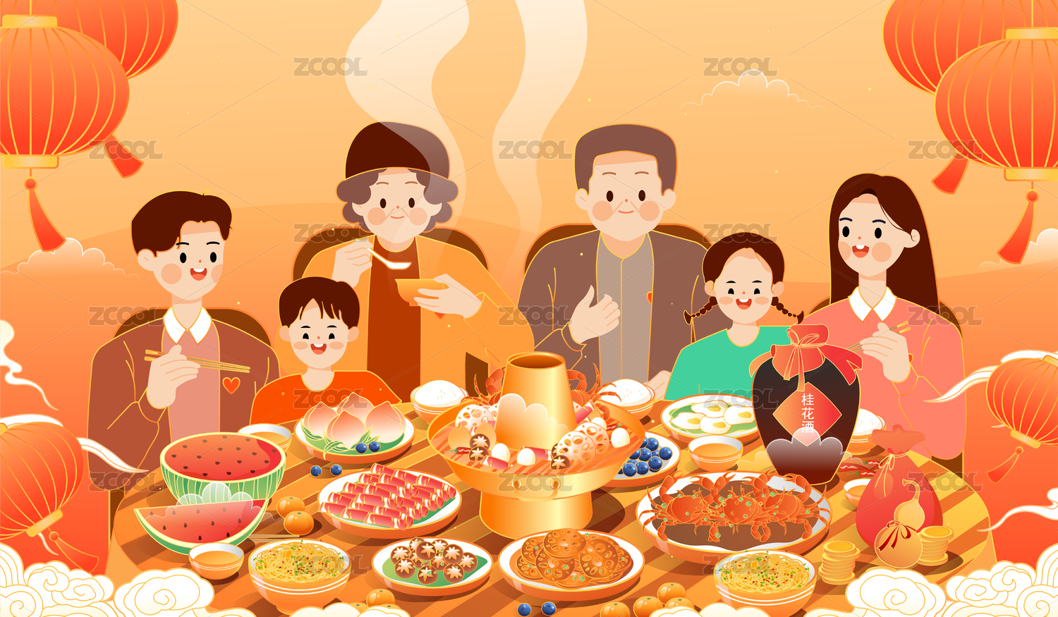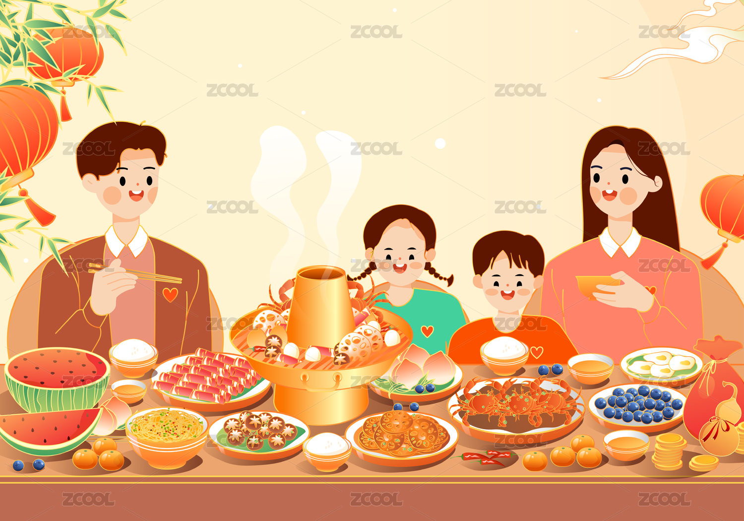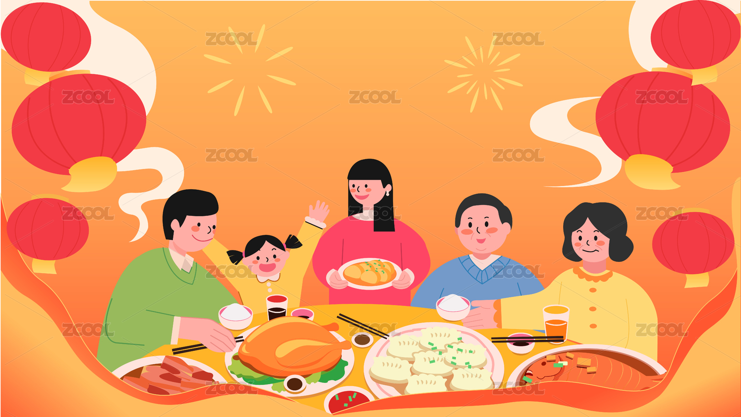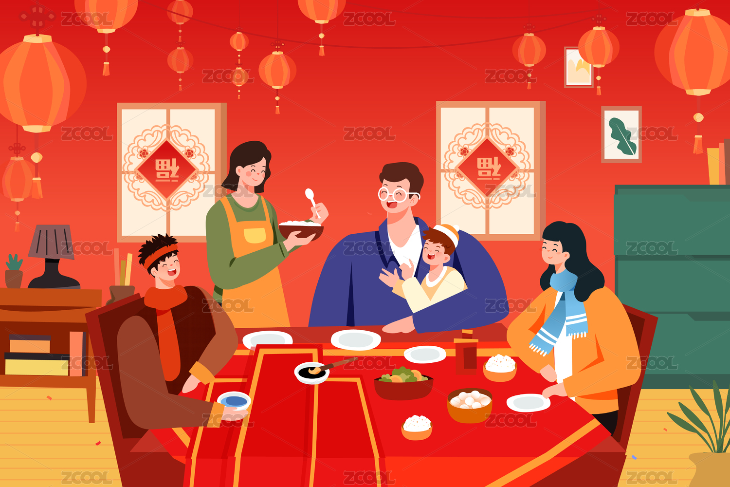 卡通新年春节年夜饭团圆饭吃饭家人团圆背景矢量插画