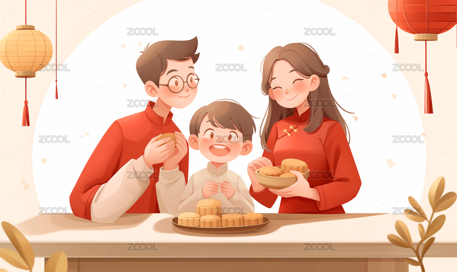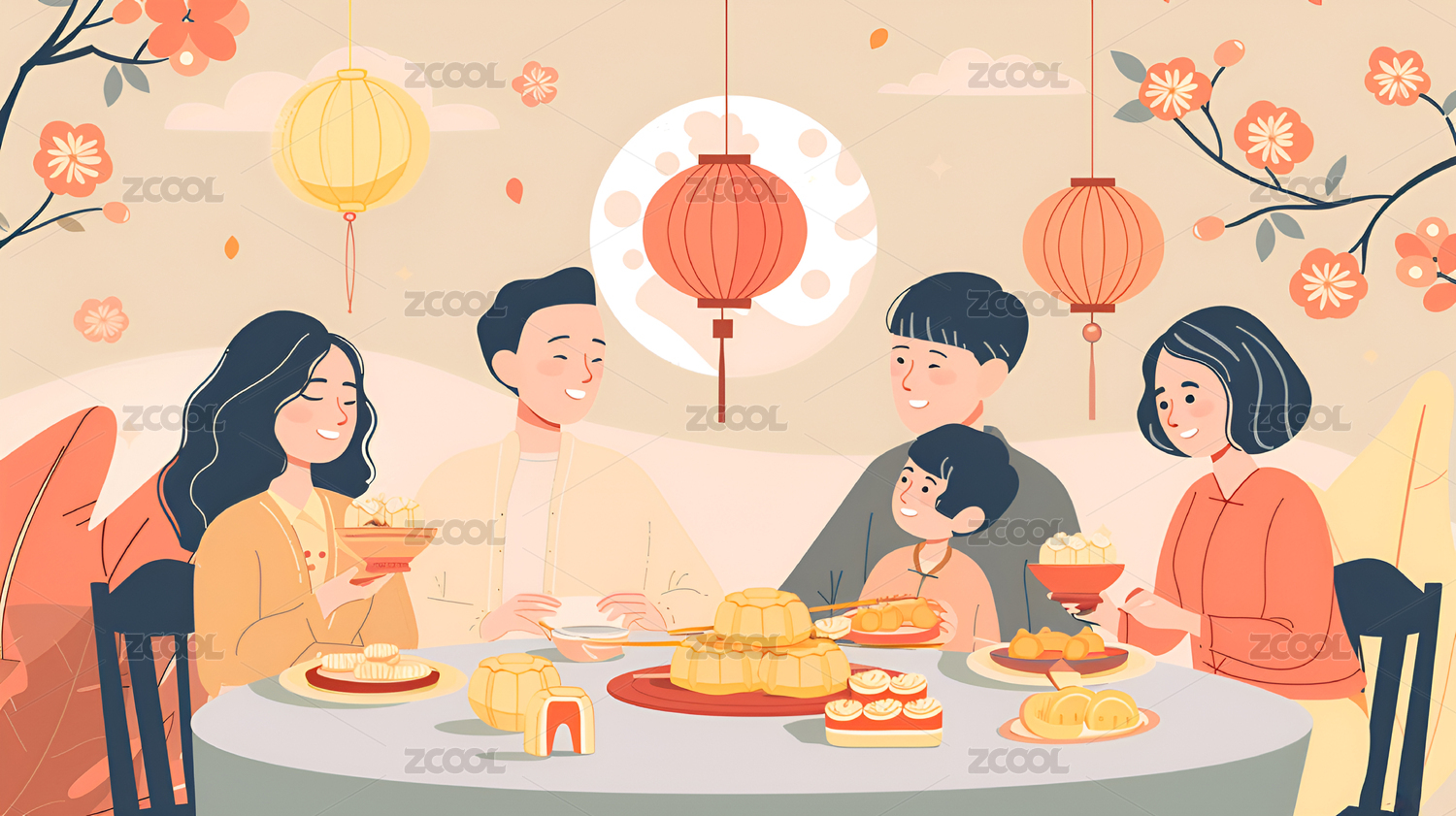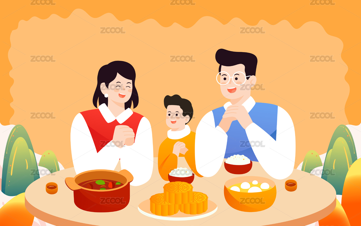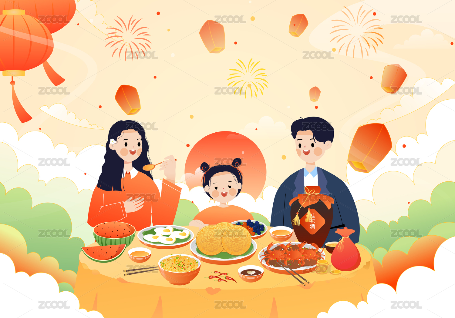 一家人,中秋节,月亮,团圆饭,背景,餐饮,插画,吃饭,传统,风格