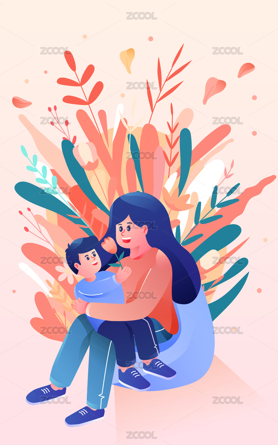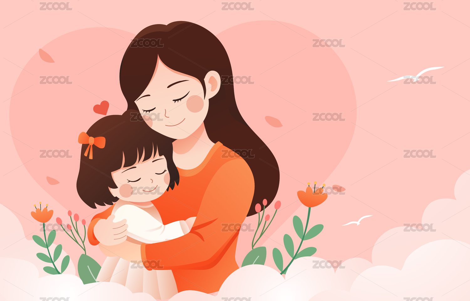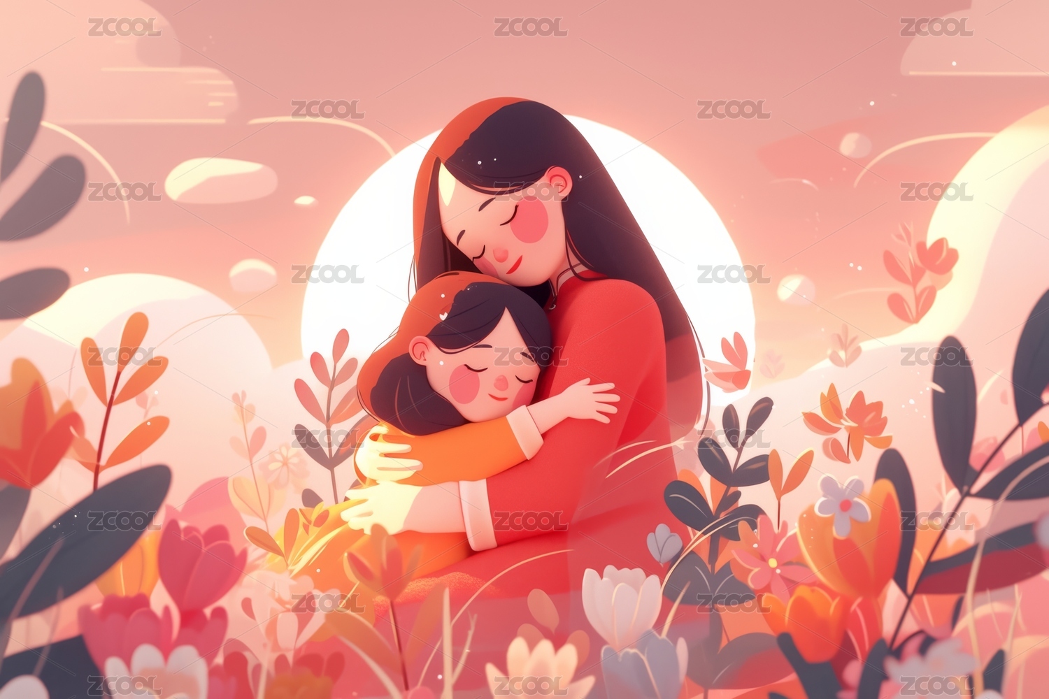 母亲节母子花丛拥抱插画感恩节家人鲜花海报