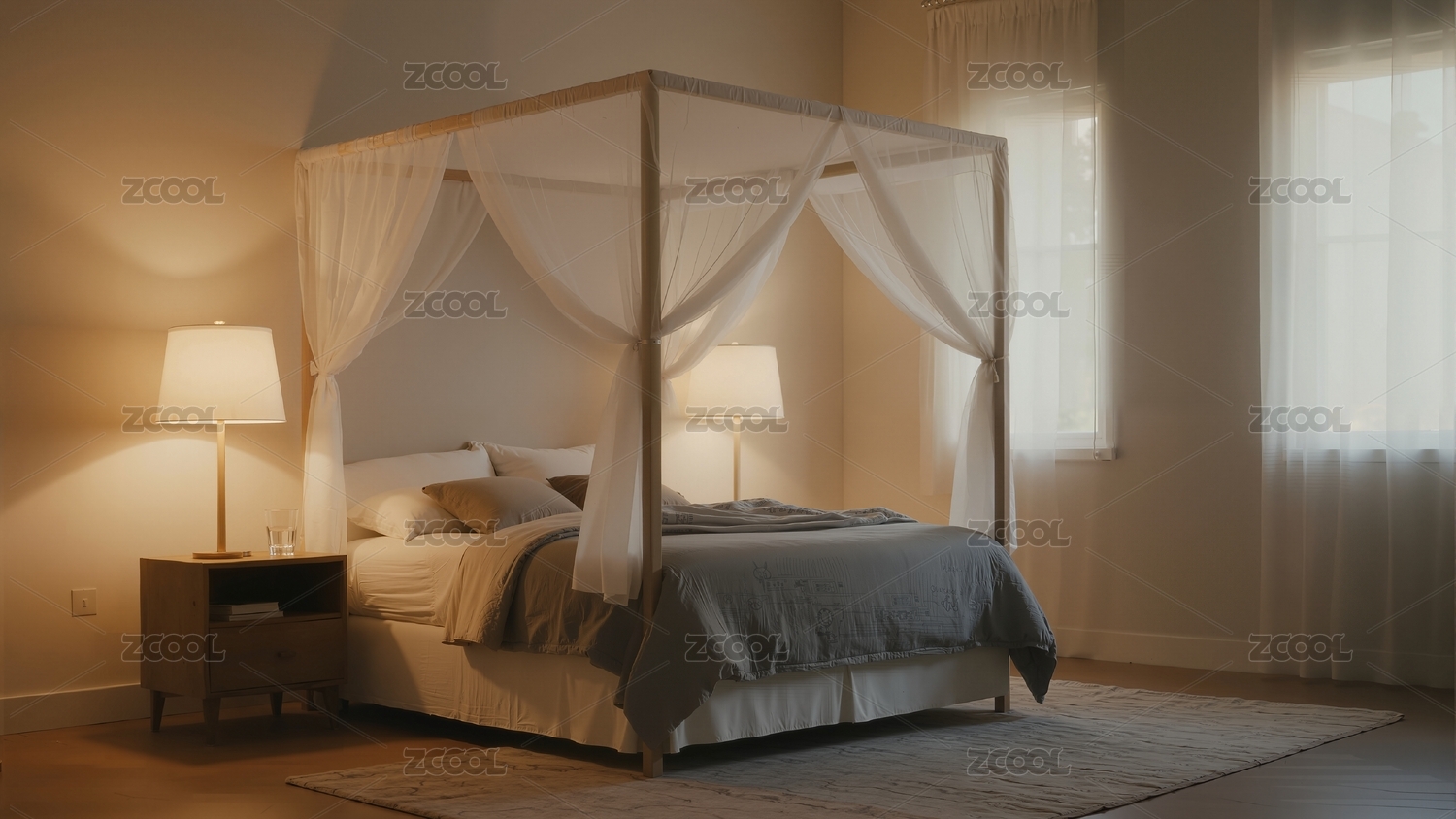 卧室,床,白色,窗帘,窗户,植物,装饰,椅子,地毯,灯光