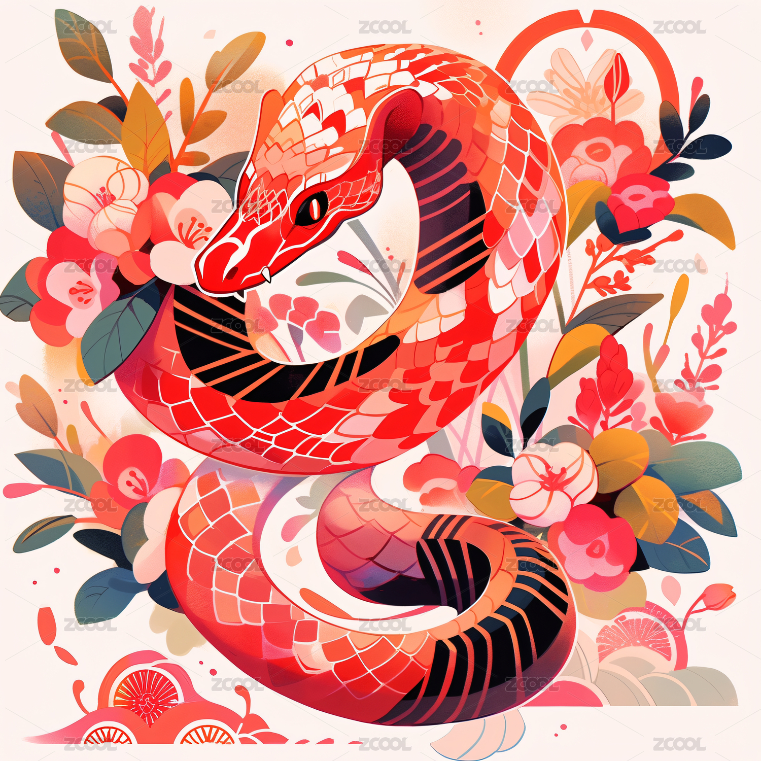 喜庆背景上艺术化的蛇在花丛中
