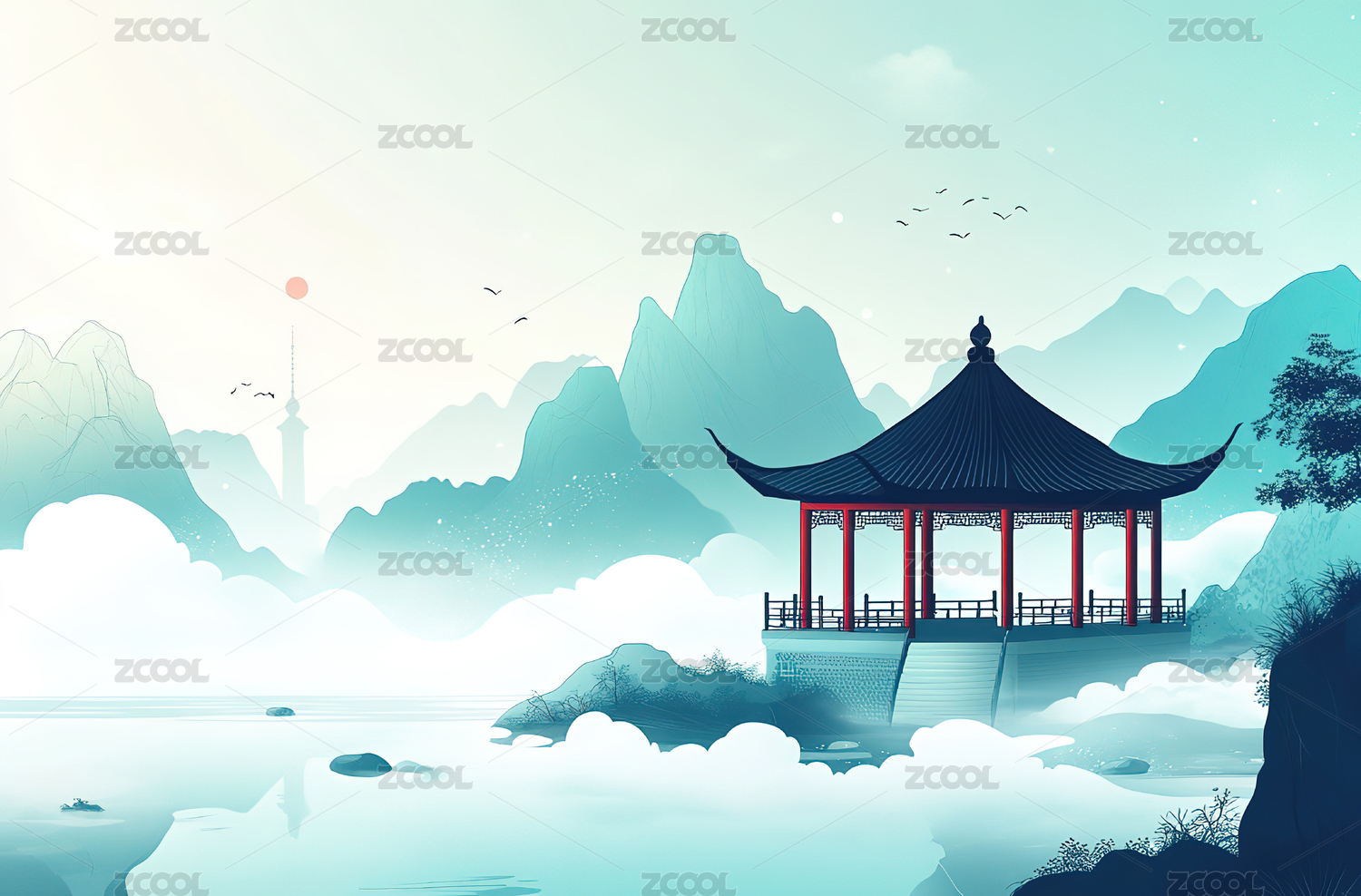 夏天荷塘湖泊广东岭南建筑山水中国风插画