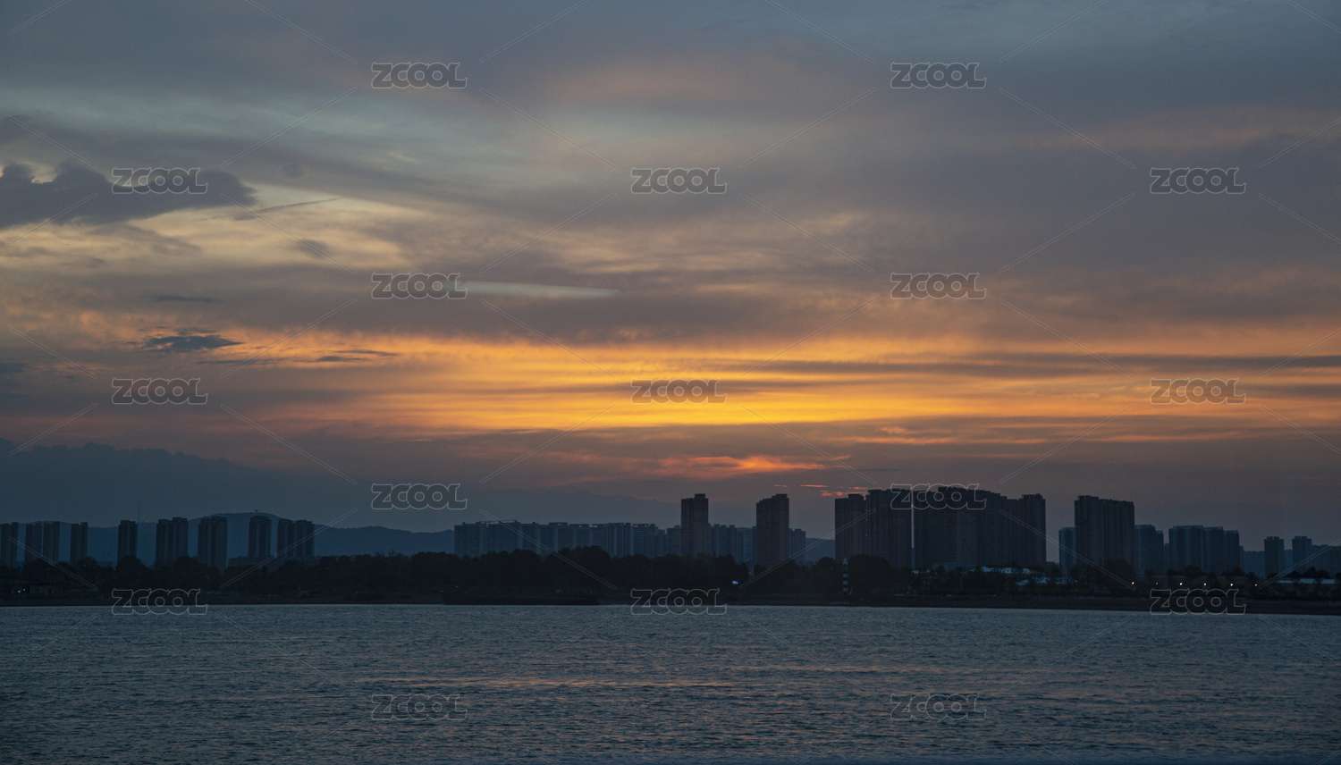 城市湖泊黄昏晚霞火烧云